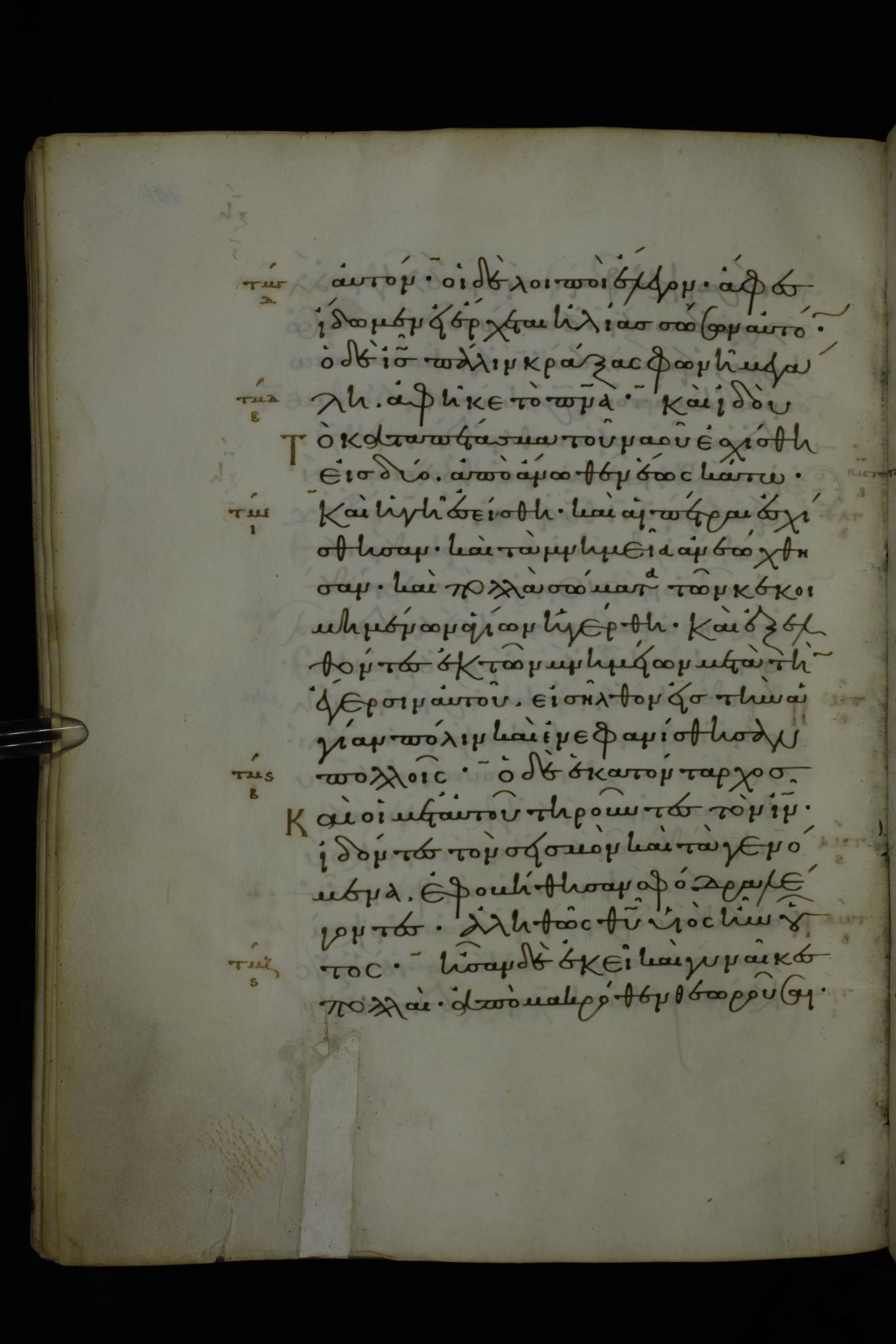 Eleventh century minuscule of Gospels on parchment; 370 leaves, 1 column, 20 lines per column. Images were taken at the National Library of Greece in Athens.