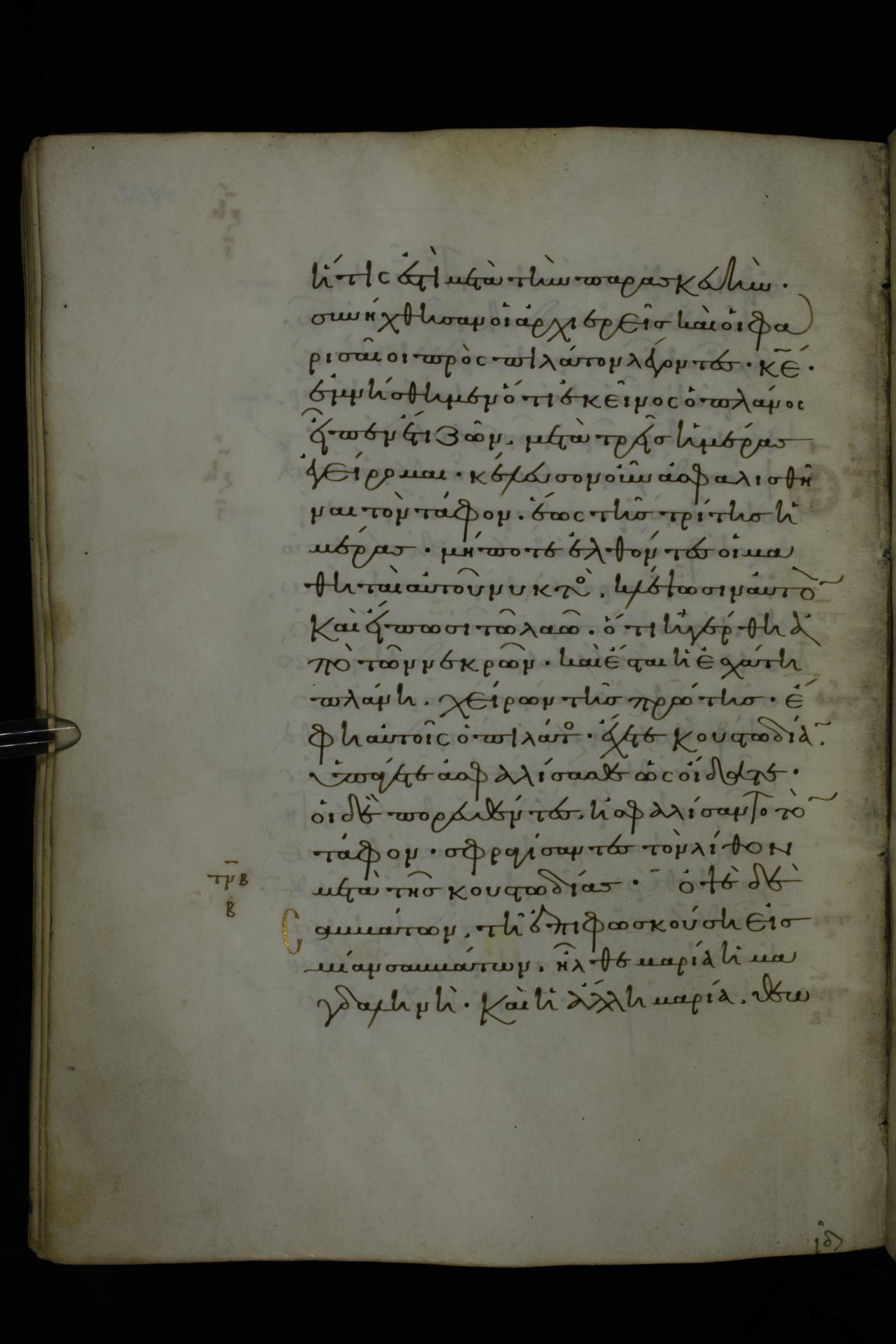 Eleventh century minuscule of Gospels on parchment; 370 leaves, 1 column, 20 lines per column. Images were taken at the National Library of Greece in Athens.