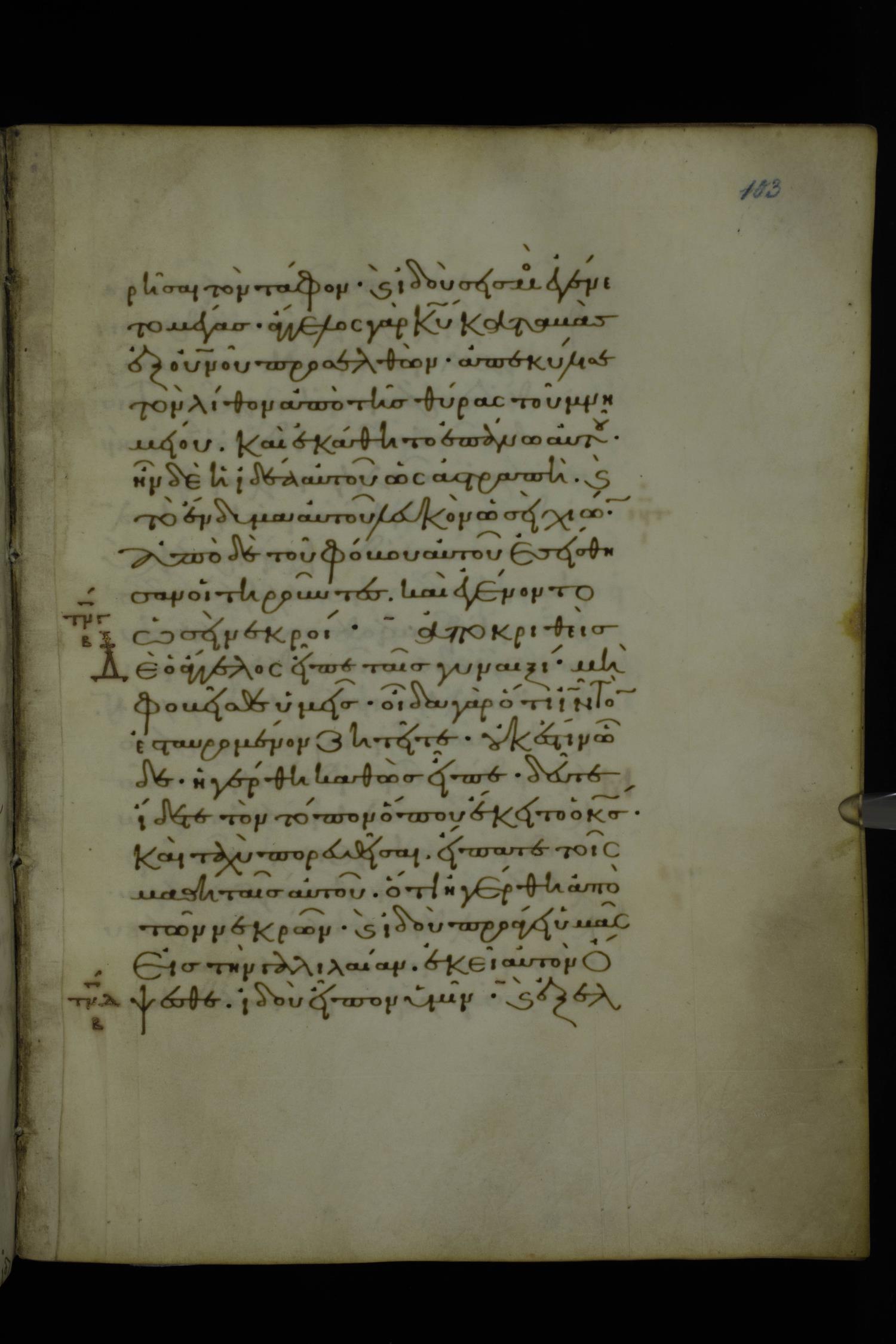 Eleventh century minuscule of Gospels on parchment; 370 leaves, 1 column, 20 lines per column. Images were taken at the National Library of Greece in Athens.