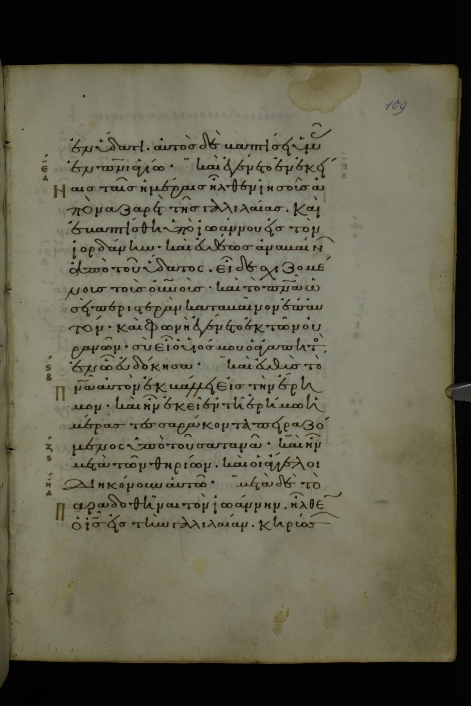 Eleventh century minuscule of Gospels on parchment; 370 leaves, 1 column, 20 lines per column. Images were taken at the National Library of Greece in Athens.