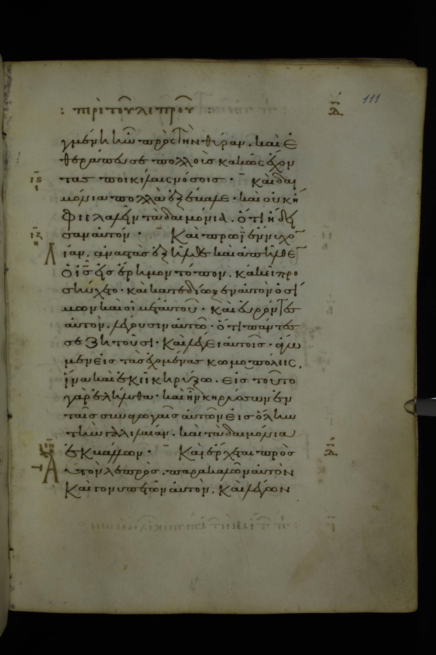 Eleventh century minuscule of Gospels on parchment; 370 leaves, 1 column, 20 lines per column. Images were taken at the National Library of Greece in Athens.