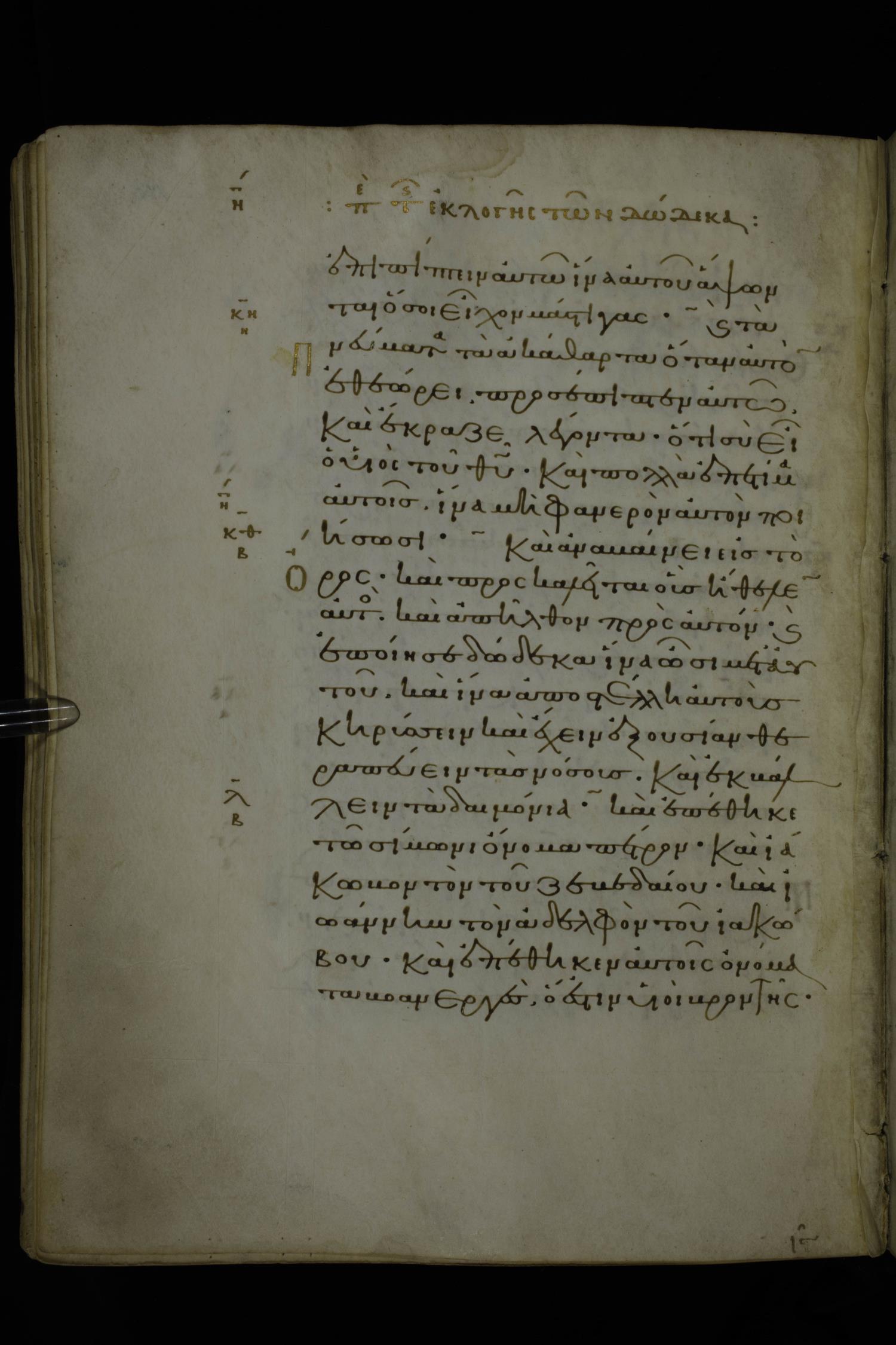 Eleventh century minuscule of Gospels on parchment; 370 leaves, 1 column, 20 lines per column. Images were taken at the National Library of Greece in Athens.