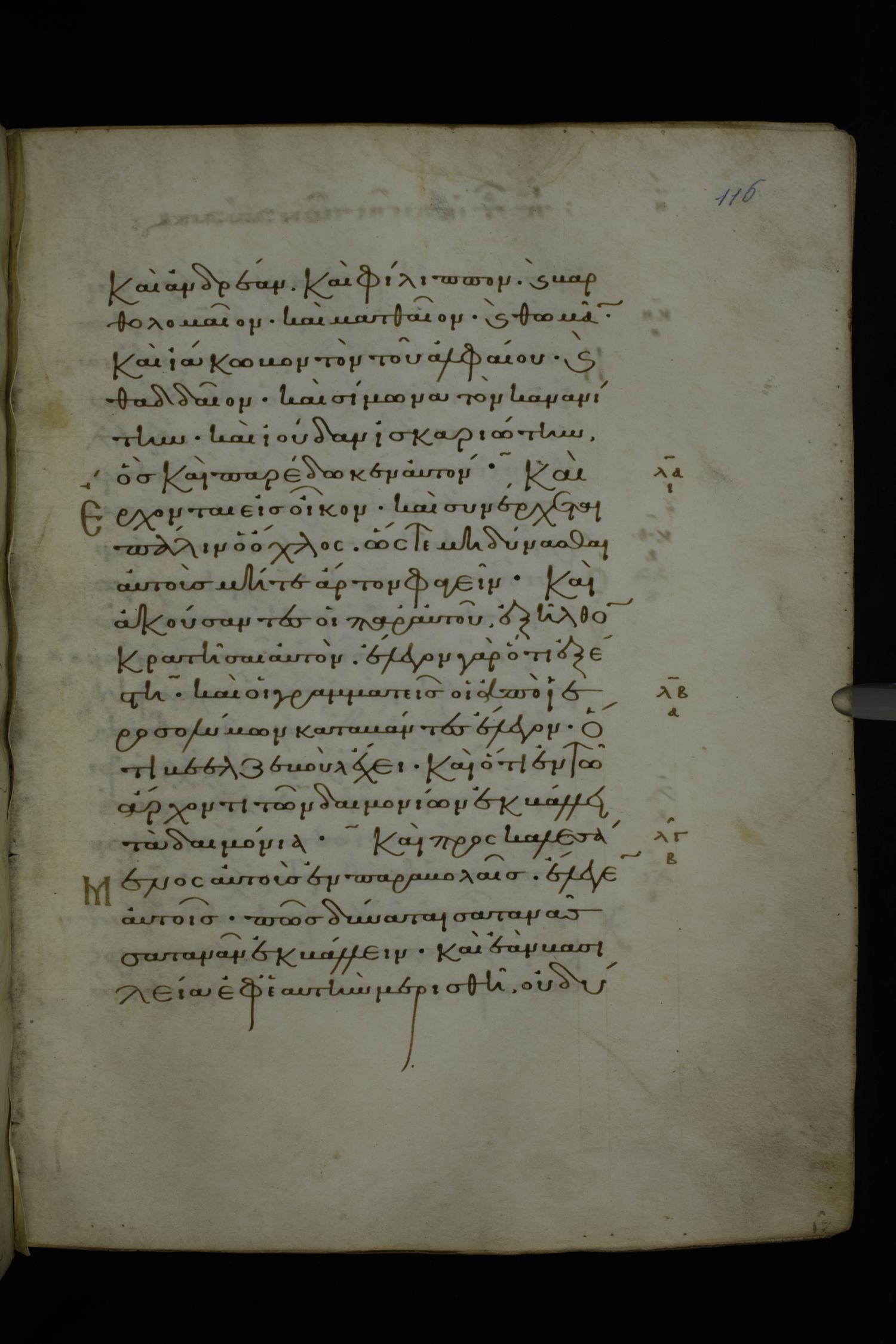 Eleventh century minuscule of Gospels on parchment; 370 leaves, 1 column, 20 lines per column. Images were taken at the National Library of Greece in Athens.