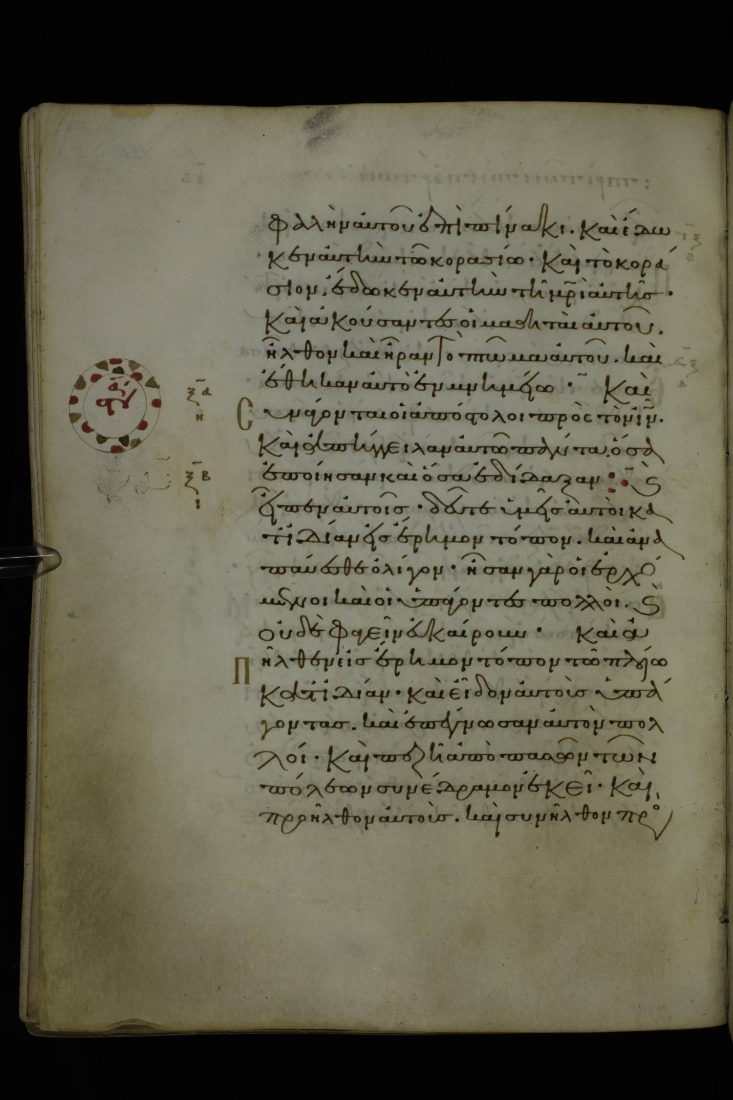 Eleventh century minuscule of Gospels on parchment; 370 leaves, 1 column, 20 lines per column. Images were taken at the National Library of Greece in Athens.