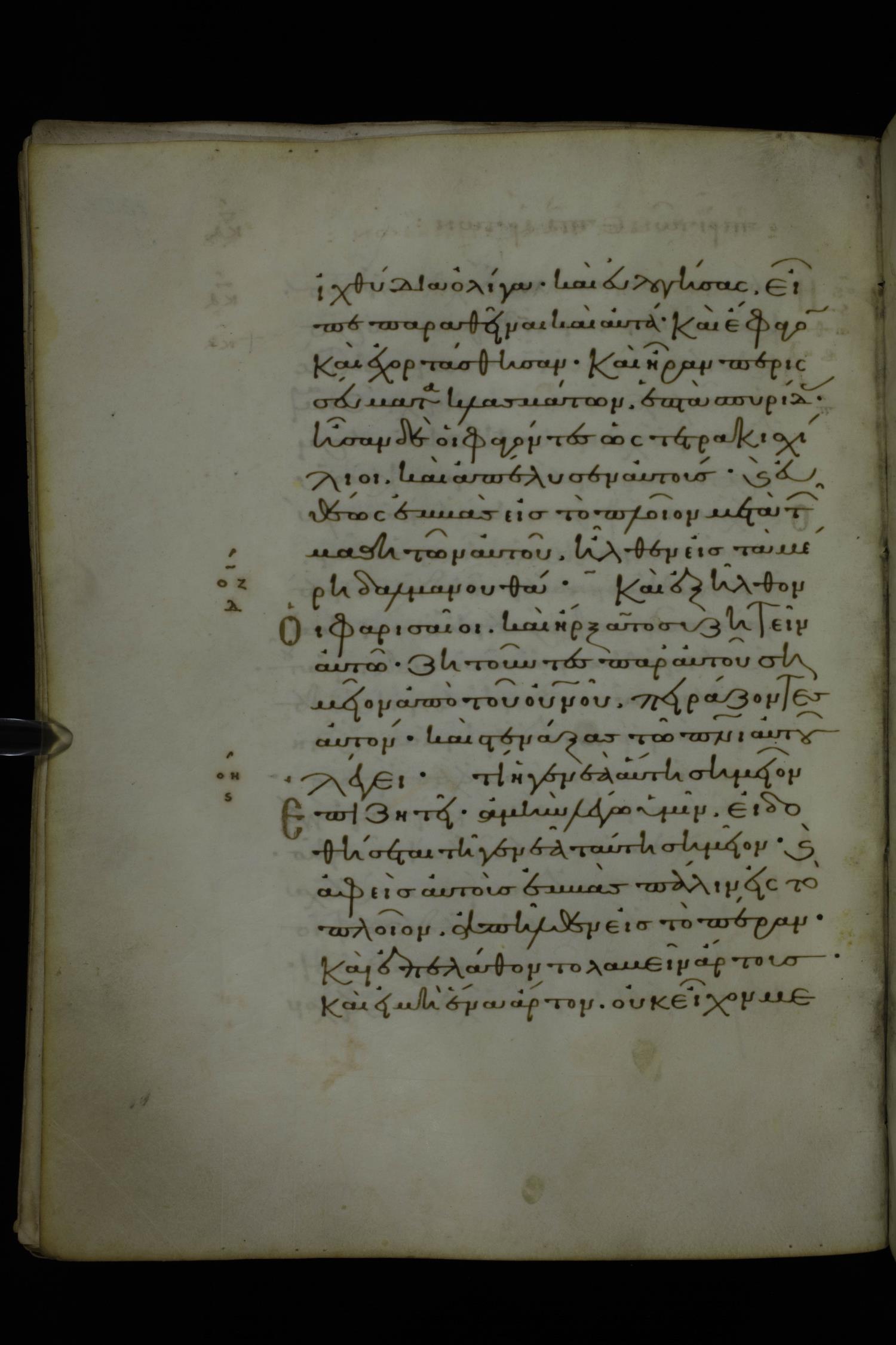 Eleventh century minuscule of Gospels on parchment; 370 leaves, 1 column, 20 lines per column. Images were taken at the National Library of Greece in Athens.