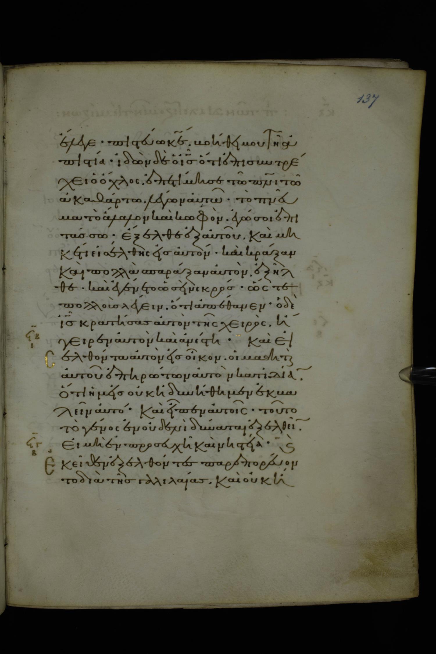 Eleventh century minuscule of Gospels on parchment; 370 leaves, 1 column, 20 lines per column. Images were taken at the National Library of Greece in Athens.