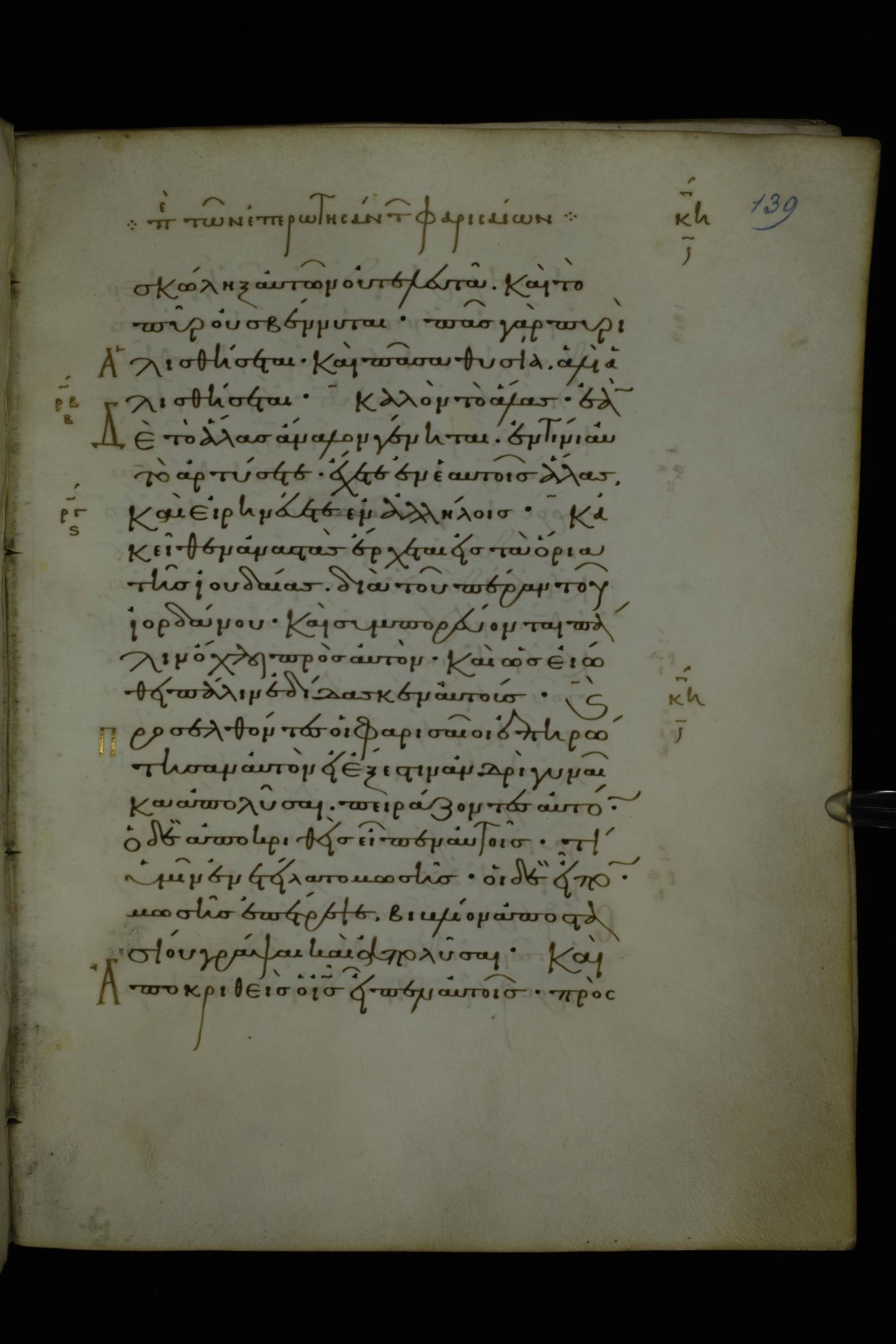 Eleventh century minuscule of Gospels on parchment; 370 leaves, 1 column, 20 lines per column. Images were taken at the National Library of Greece in Athens.