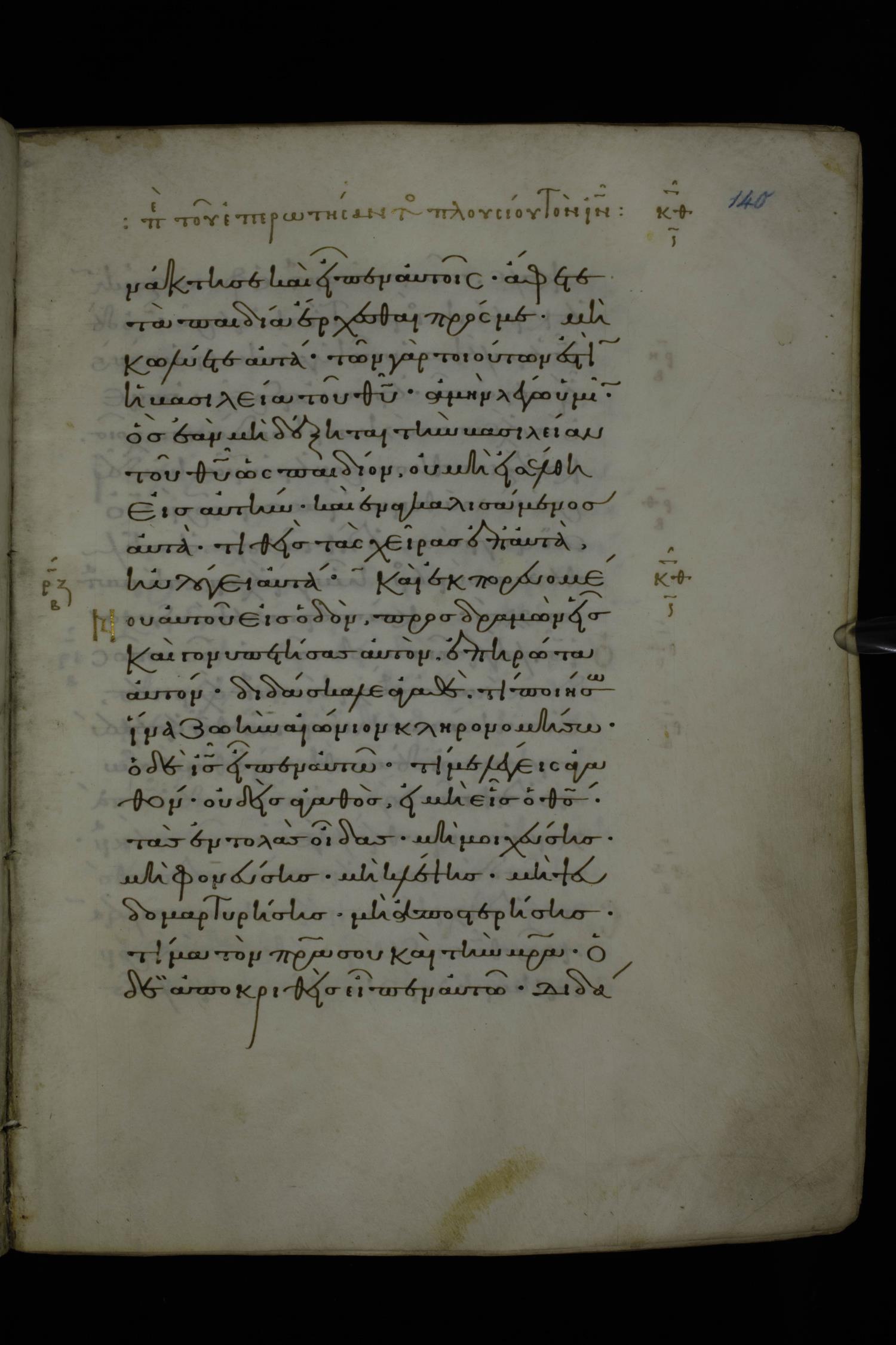 Eleventh century minuscule of Gospels on parchment; 370 leaves, 1 column, 20 lines per column. Images were taken at the National Library of Greece in Athens.