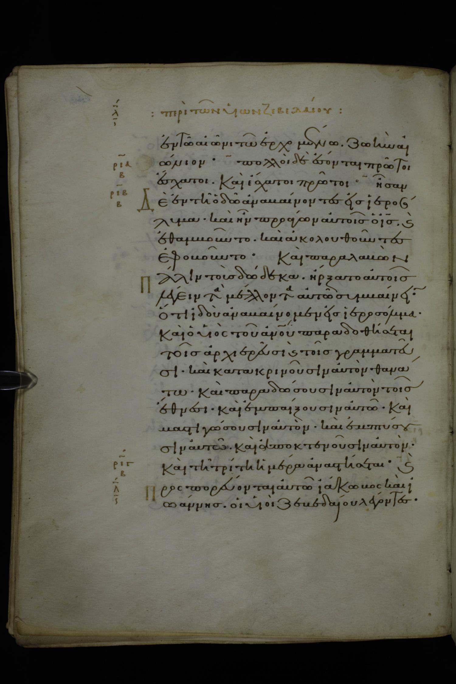Eleventh century minuscule of Gospels on parchment; 370 leaves, 1 column, 20 lines per column. Images were taken at the National Library of Greece in Athens.