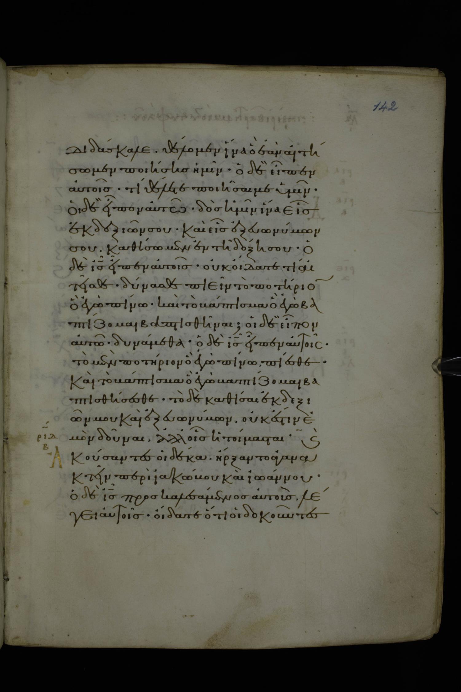 Eleventh century minuscule of Gospels on parchment; 370 leaves, 1 column, 20 lines per column. Images were taken at the National Library of Greece in Athens.