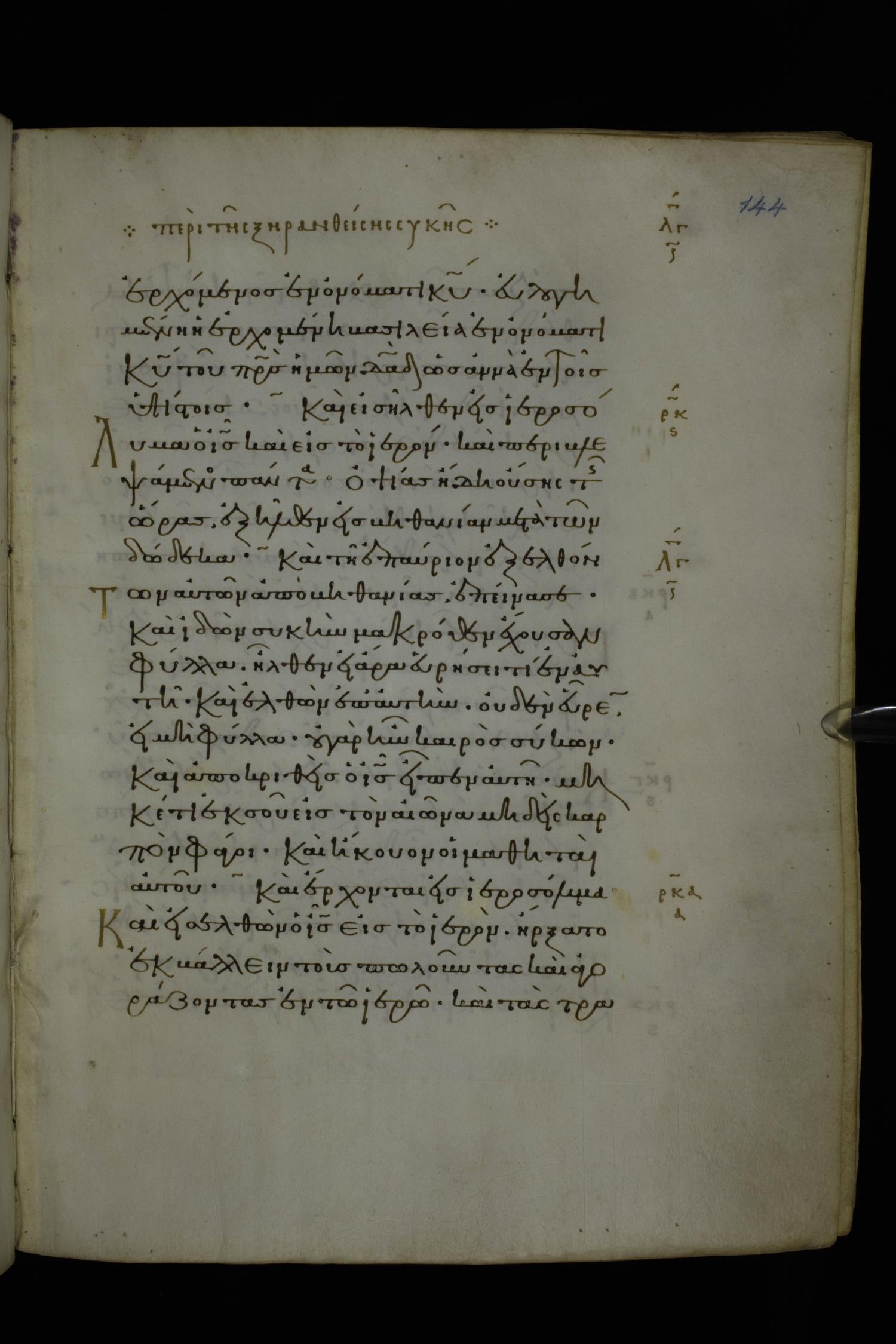 Eleventh century minuscule of Gospels on parchment; 370 leaves, 1 column, 20 lines per column. Images were taken at the National Library of Greece in Athens.