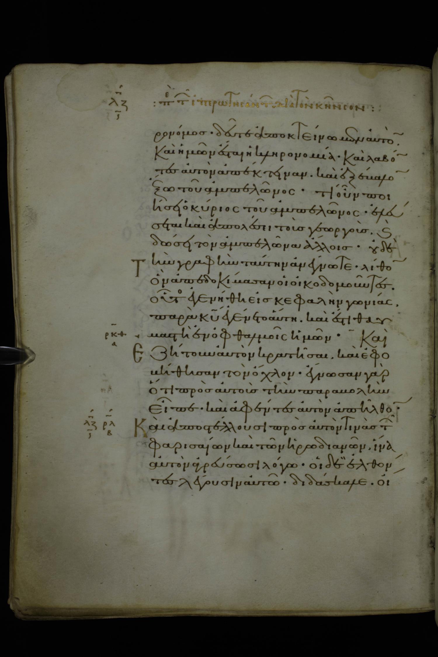 Eleventh century minuscule of Gospels on parchment; 370 leaves, 1 column, 20 lines per column. Images were taken at the National Library of Greece in Athens.