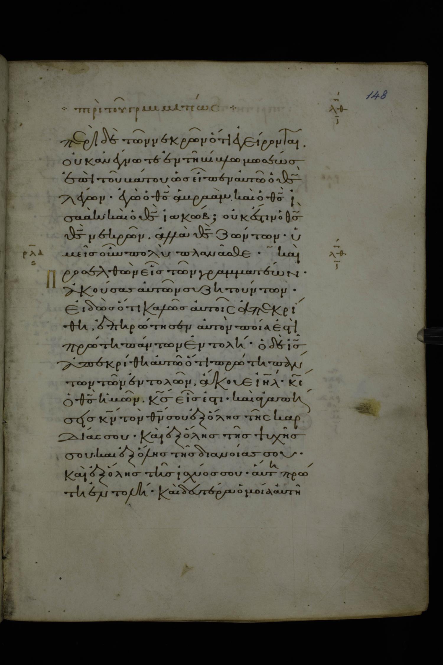 Eleventh century minuscule of Gospels on parchment; 370 leaves, 1 column, 20 lines per column. Images were taken at the National Library of Greece in Athens.