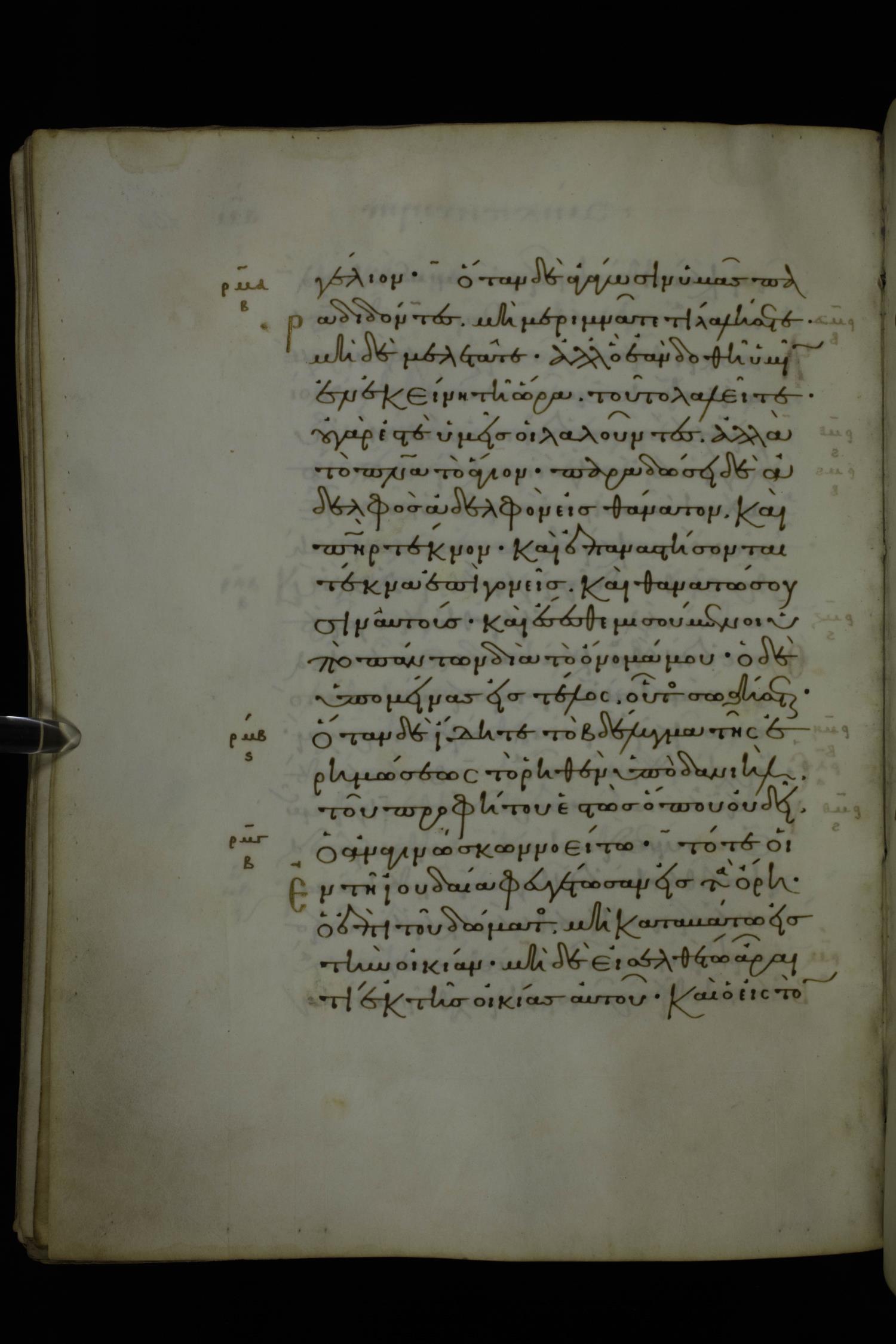 Eleventh century minuscule of Gospels on parchment; 370 leaves, 1 column, 20 lines per column. Images were taken at the National Library of Greece in Athens.
