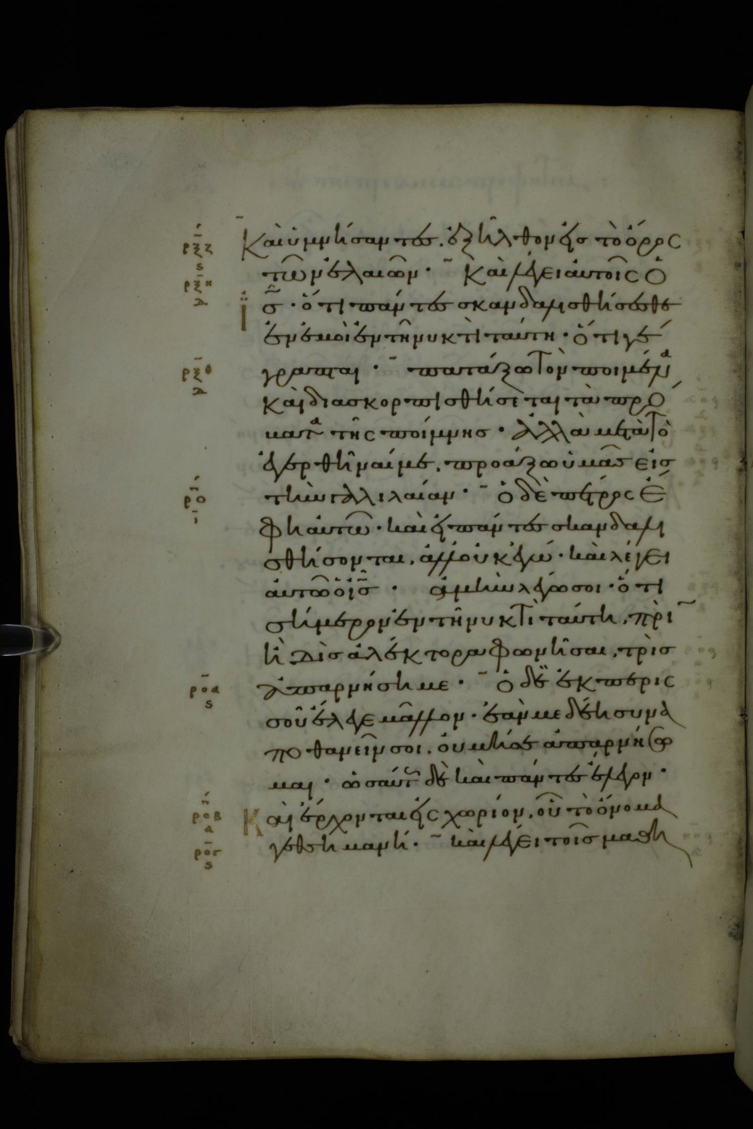 Eleventh century minuscule of Gospels on parchment; 370 leaves, 1 column, 20 lines per column. Images were taken at the National Library of Greece in Athens.