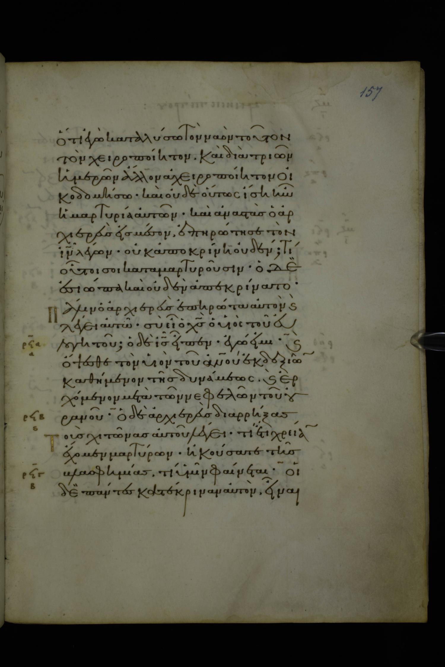 Eleventh century minuscule of Gospels on parchment; 370 leaves, 1 column, 20 lines per column. Images were taken at the National Library of Greece in Athens.