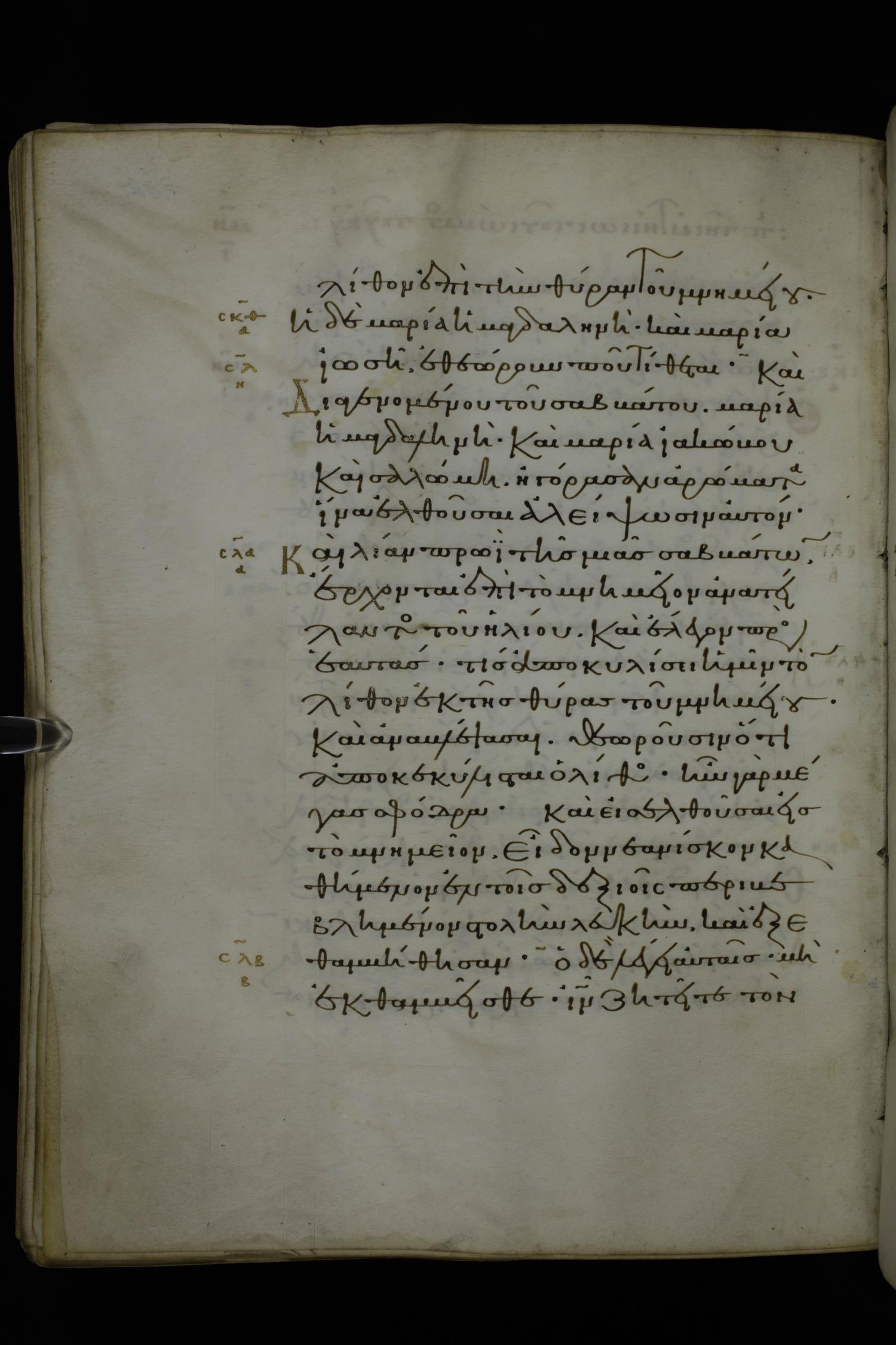 Καὶ διαγενομένου τοῦ σαββάτου (ἡ) Μαρία ἡ Μαγδαληνὴ καὶ Μαρία ἡ τοῦ Ἰακώβου καὶ Σαλώμη ἠγόρασαν ἀρώματα ἵνα ἐλθοῦσαι ἀλείψωσιν αὐτόν.