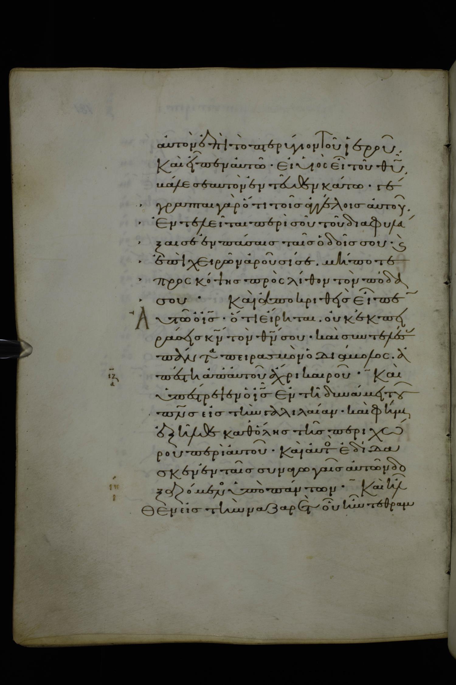 Eleventh century minuscule of Gospels on parchment; 370 leaves, 1 column, 20 lines per column. Images were taken at the National Library of Greece in Athens.