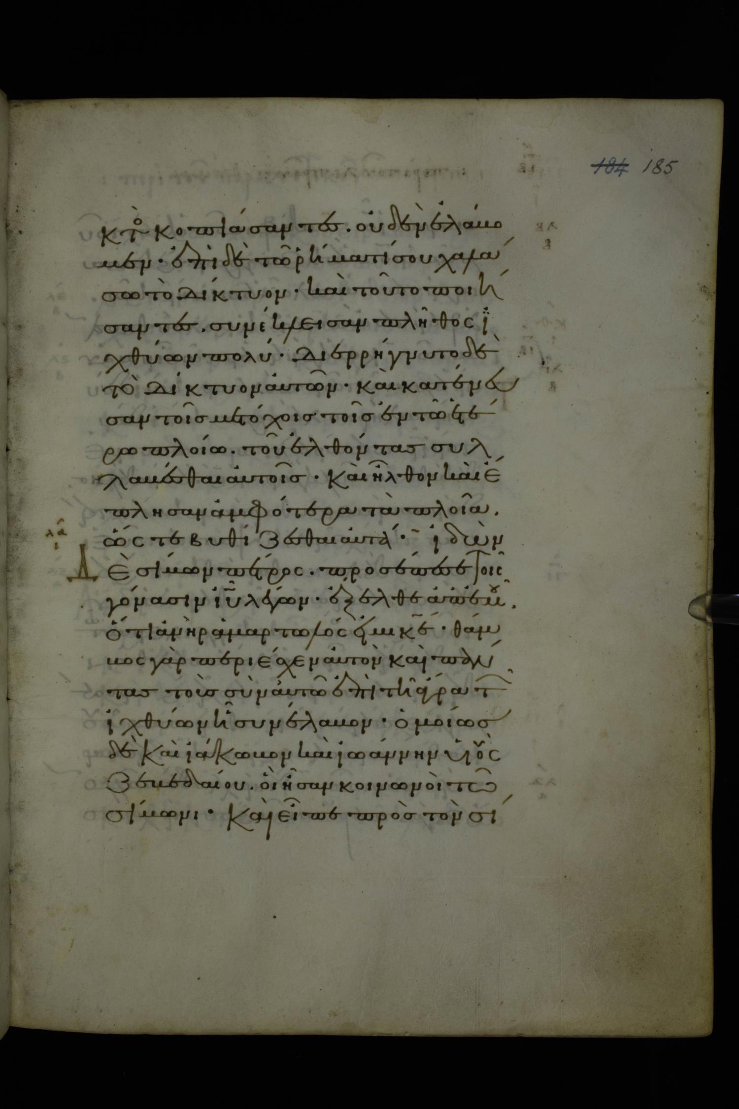 Eleventh century minuscule of Gospels on parchment; 370 leaves, 1 column, 20 lines per column. Images were taken at the National Library of Greece in Athens.