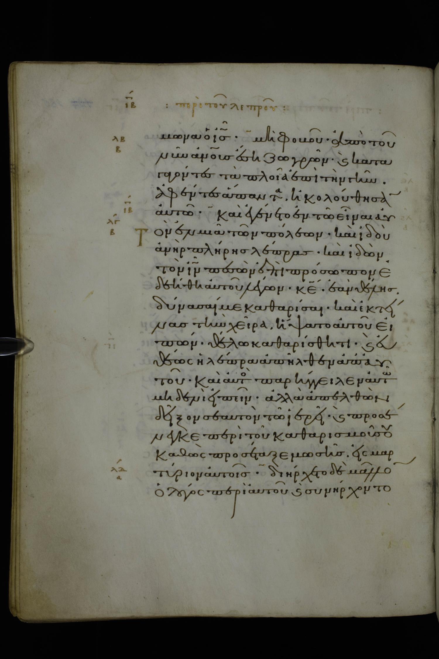 Eleventh century minuscule of Gospels on parchment; 370 leaves, 1 column, 20 lines per column. Images were taken at the National Library of Greece in Athens.