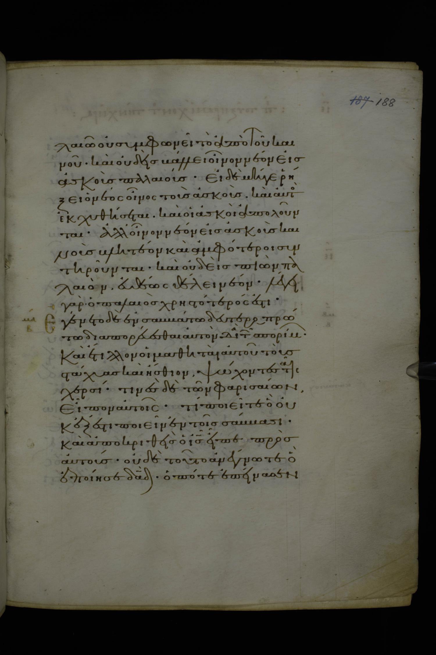Eleventh century minuscule of Gospels on parchment; 370 leaves, 1 column, 20 lines per column. Images were taken at the National Library of Greece in Athens.