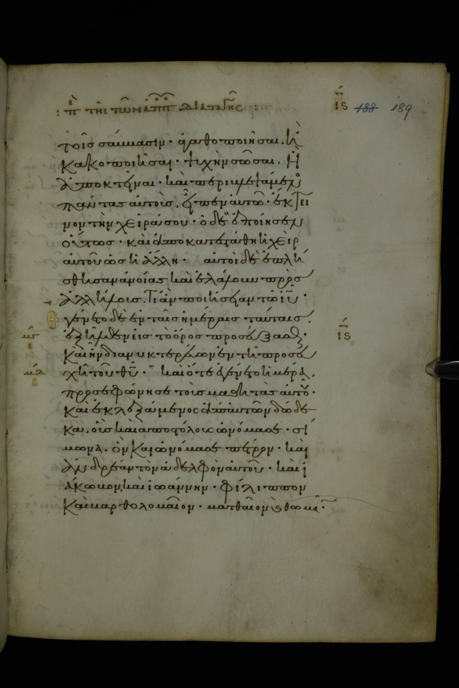 Eleventh century minuscule of Gospels on parchment; 370 leaves, 1 column, 20 lines per column. Images were taken at the National Library of Greece in Athens.