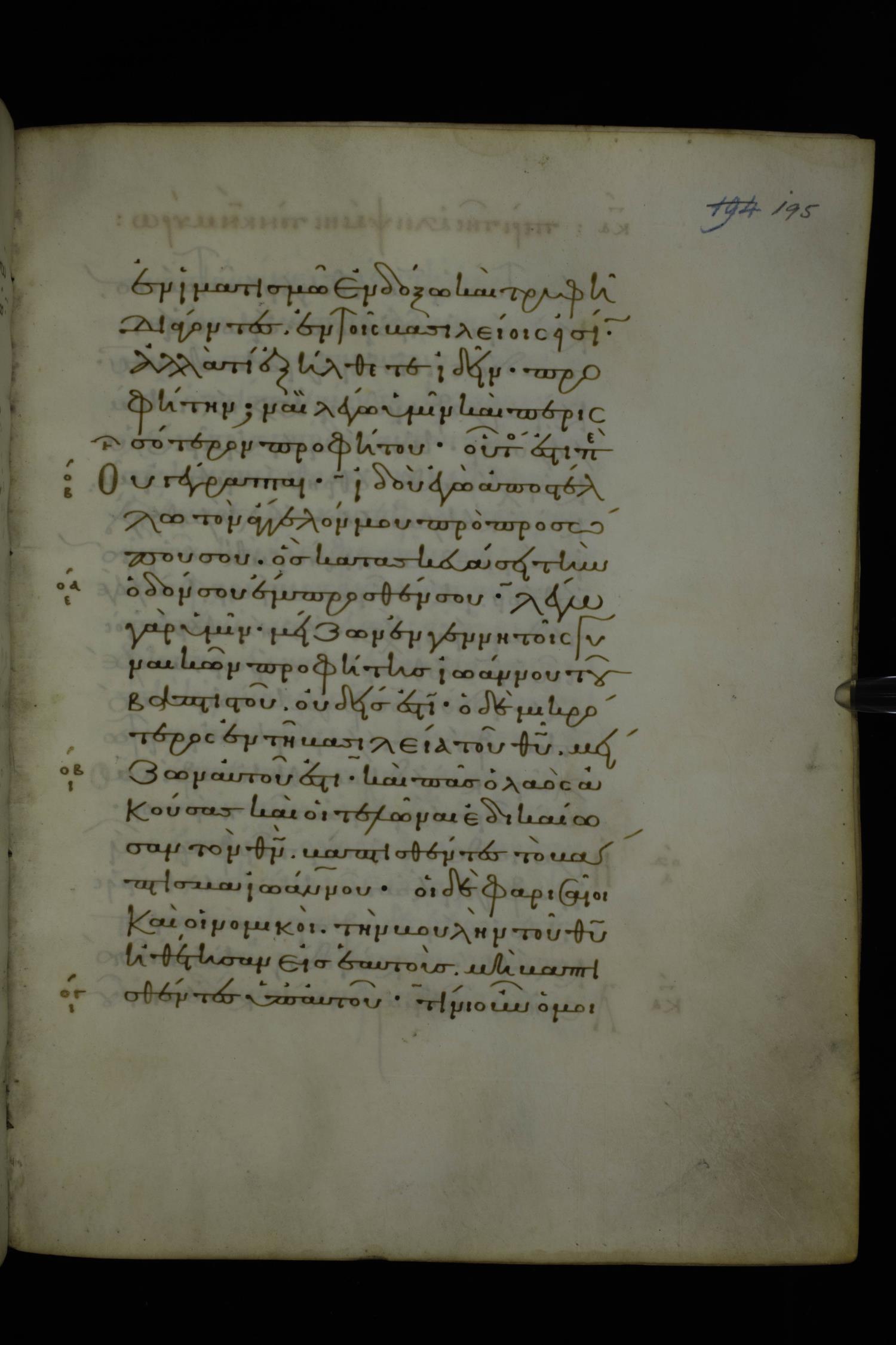 Eleventh century minuscule of Gospels on parchment; 370 leaves, 1 column, 20 lines per column. Images were taken at the National Library of Greece in Athens.