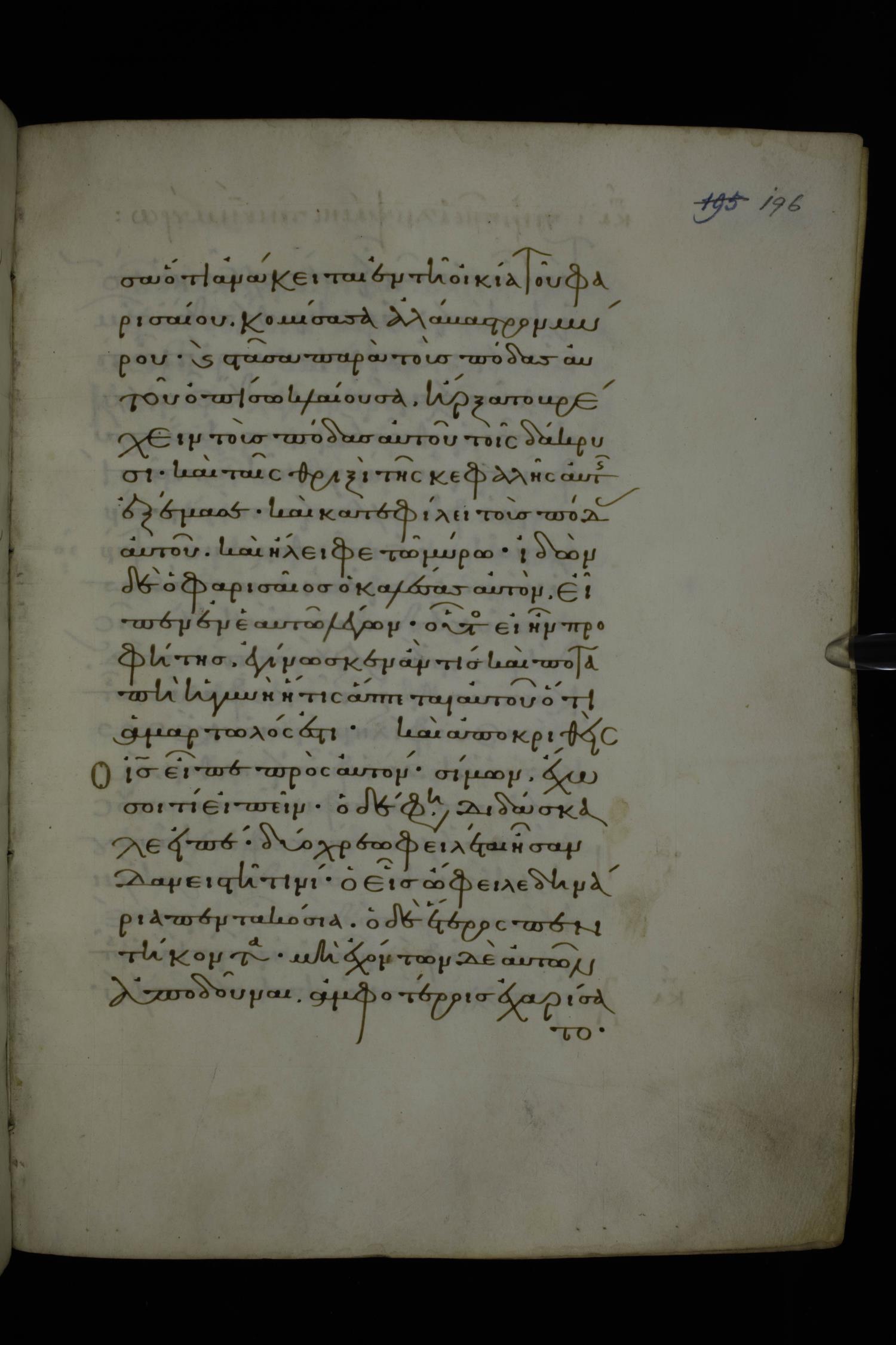 Eleventh century minuscule of Gospels on parchment; 370 leaves, 1 column, 20 lines per column. Images were taken at the National Library of Greece in Athens.
