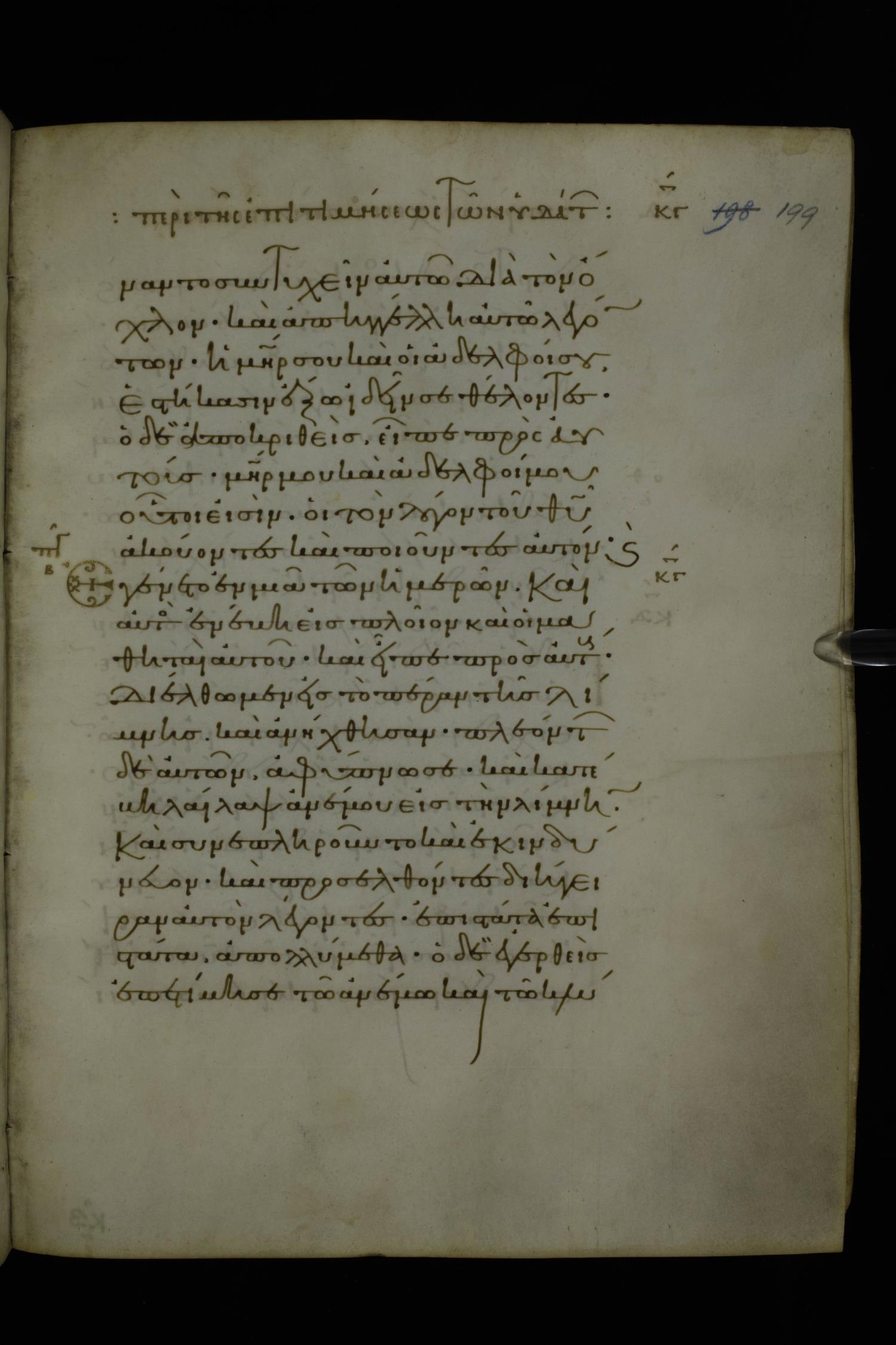 Eleventh century minuscule of Gospels on parchment; 370 leaves, 1 column, 20 lines per column. Images were taken at the National Library of Greece in Athens.