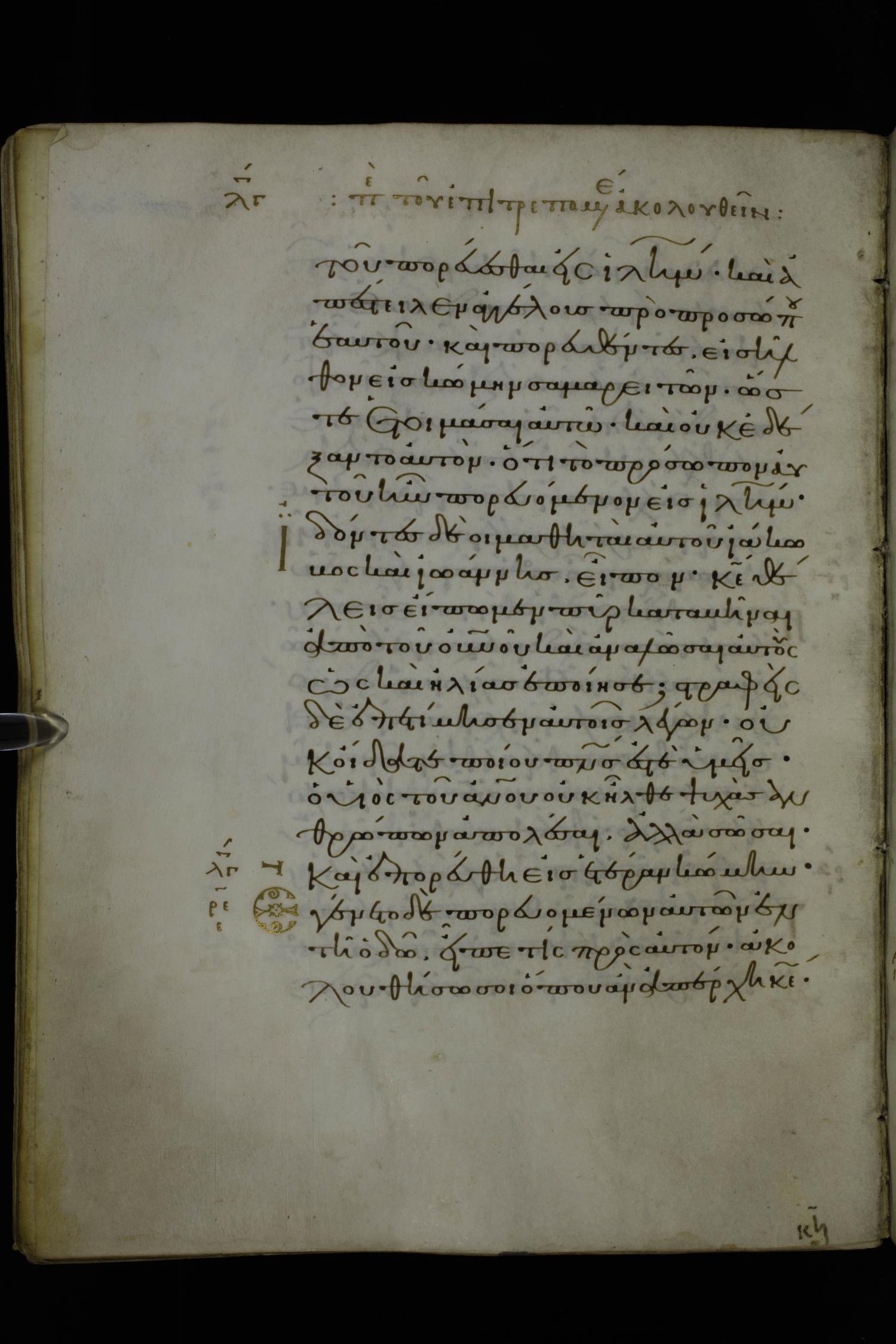 Eleventh century minuscule of Gospels on parchment; 370 leaves, 1 column, 20 lines per column. Images were taken at the National Library of Greece in Athens.