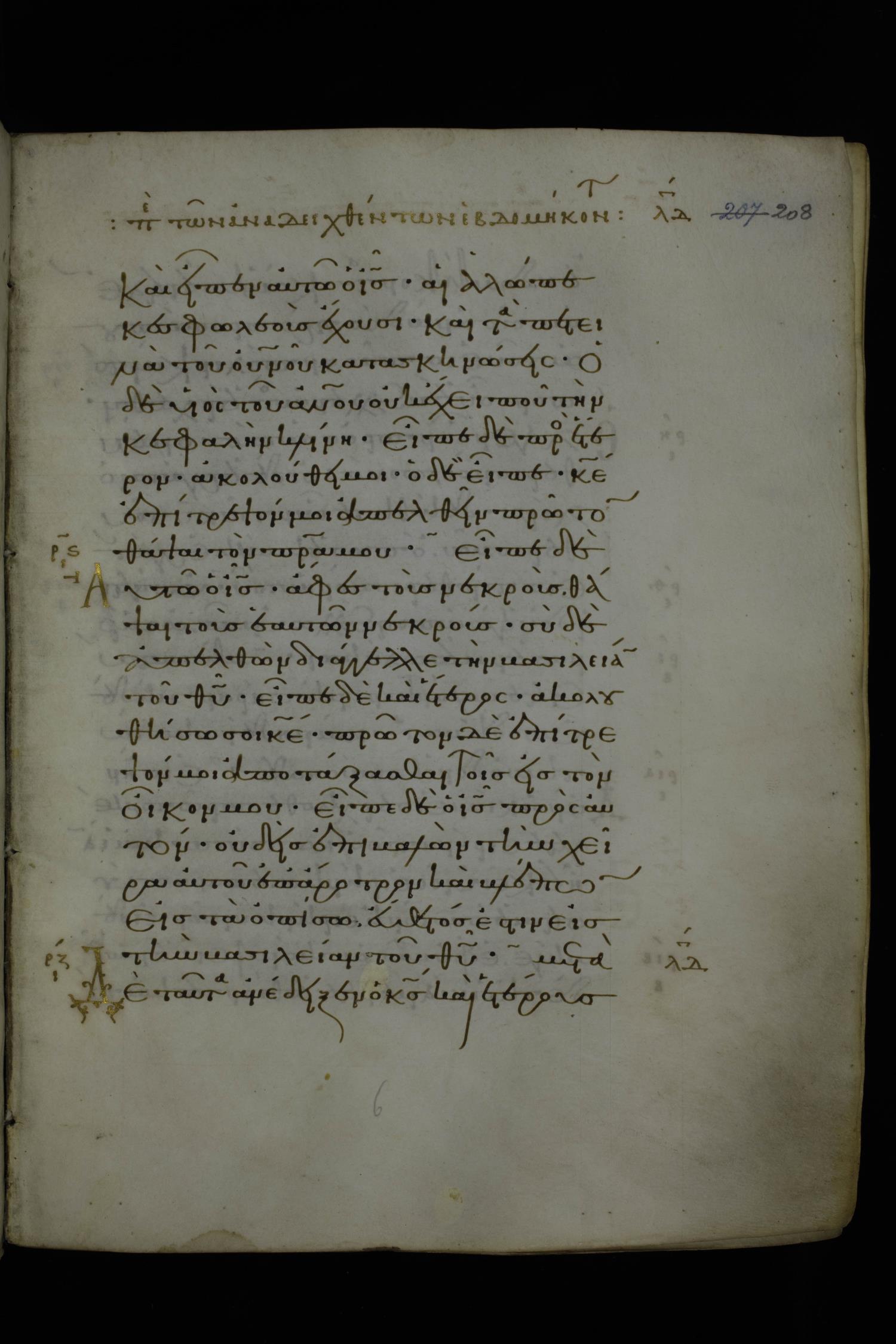 Eleventh century minuscule of Gospels on parchment; 370 leaves, 1 column, 20 lines per column. Images were taken at the National Library of Greece in Athens.