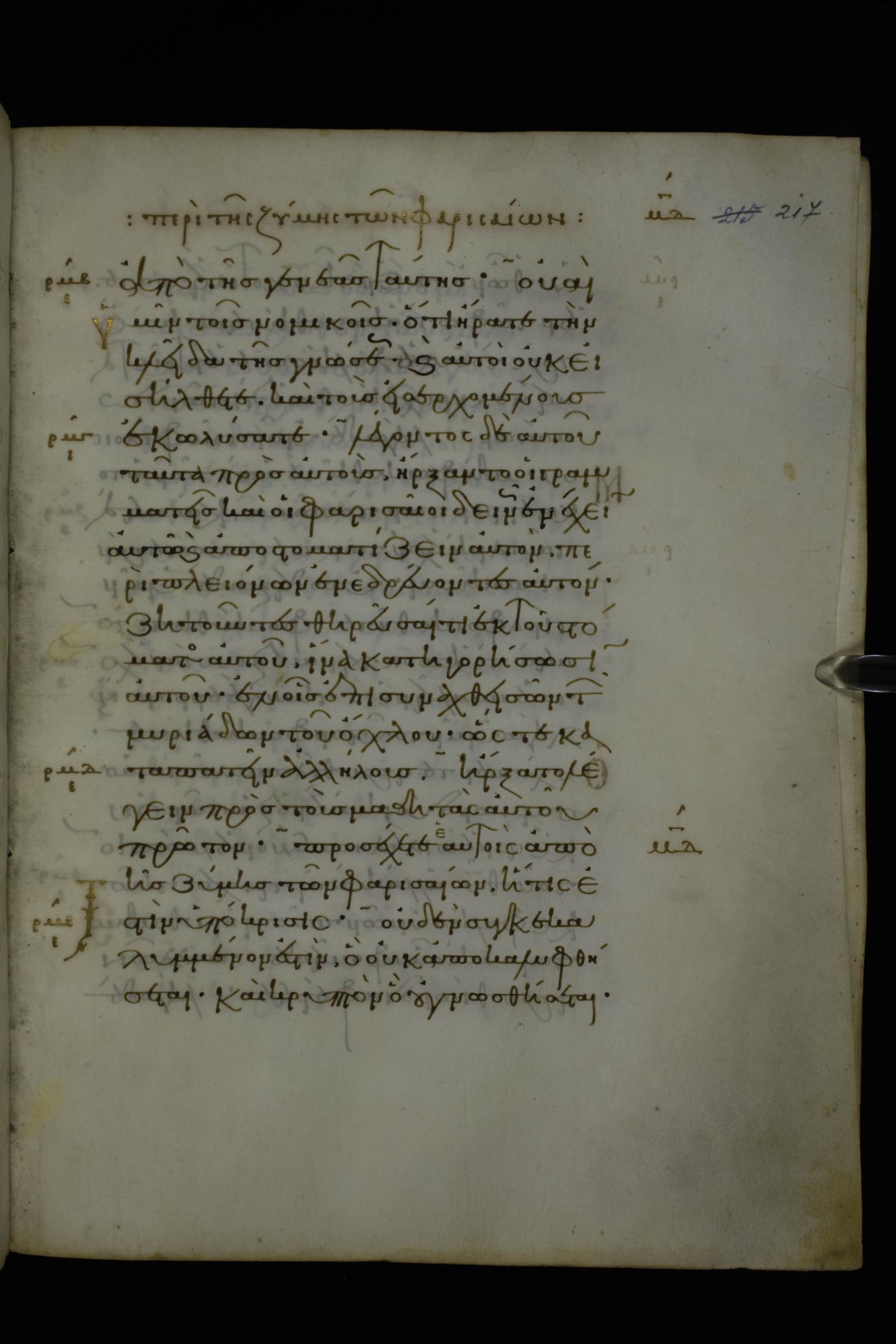 Eleventh century minuscule of Gospels on parchment; 370 leaves, 1 column, 20 lines per column. Images were taken at the National Library of Greece in Athens.