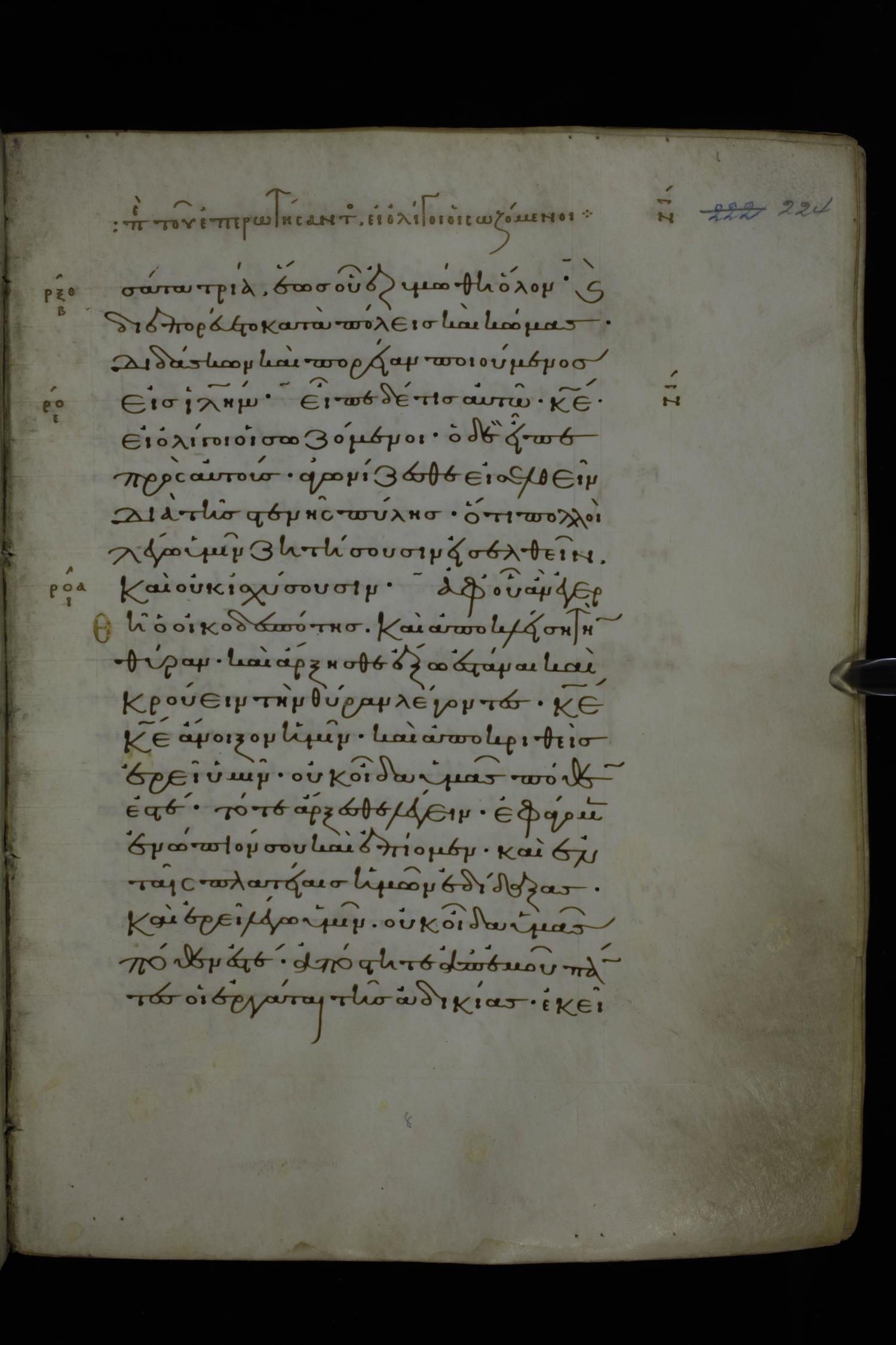 Eleventh century minuscule of Gospels on parchment; 370 leaves, 1 column, 20 lines per column. Images were taken at the National Library of Greece in Athens.