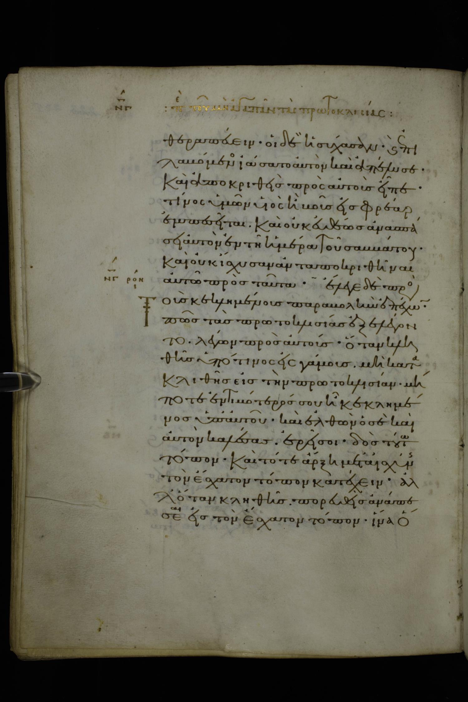 Eleventh century minuscule of Gospels on parchment; 370 leaves, 1 column, 20 lines per column. Images were taken at the National Library of Greece in Athens.