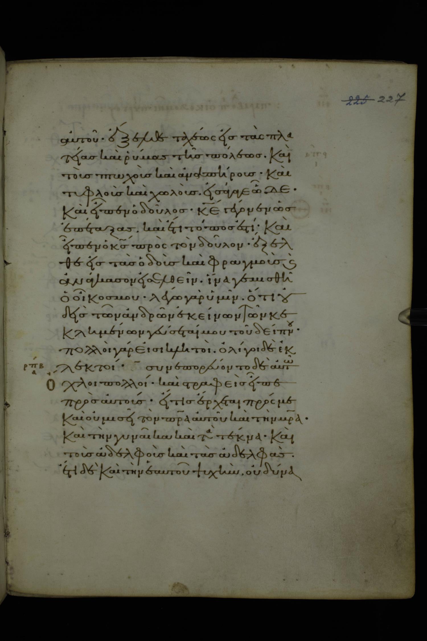 Eleventh century minuscule of Gospels on parchment; 370 leaves, 1 column, 20 lines per column. Images were taken at the National Library of Greece in Athens.
