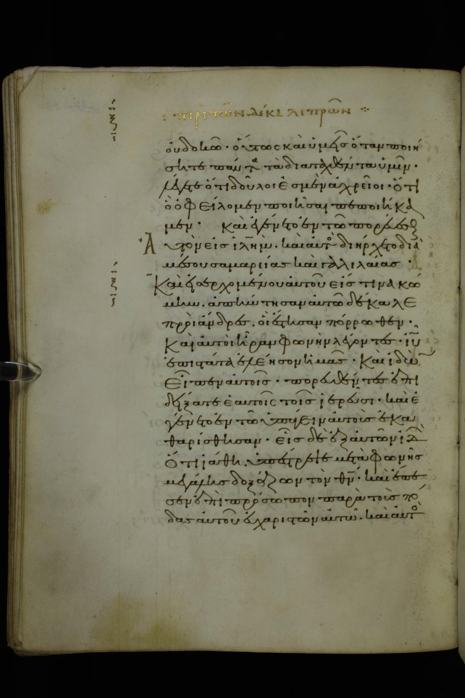 Eleventh century minuscule of Gospels on parchment; 370 leaves, 1 column, 20 lines per column. Images were taken at the National Library of Greece in Athens.