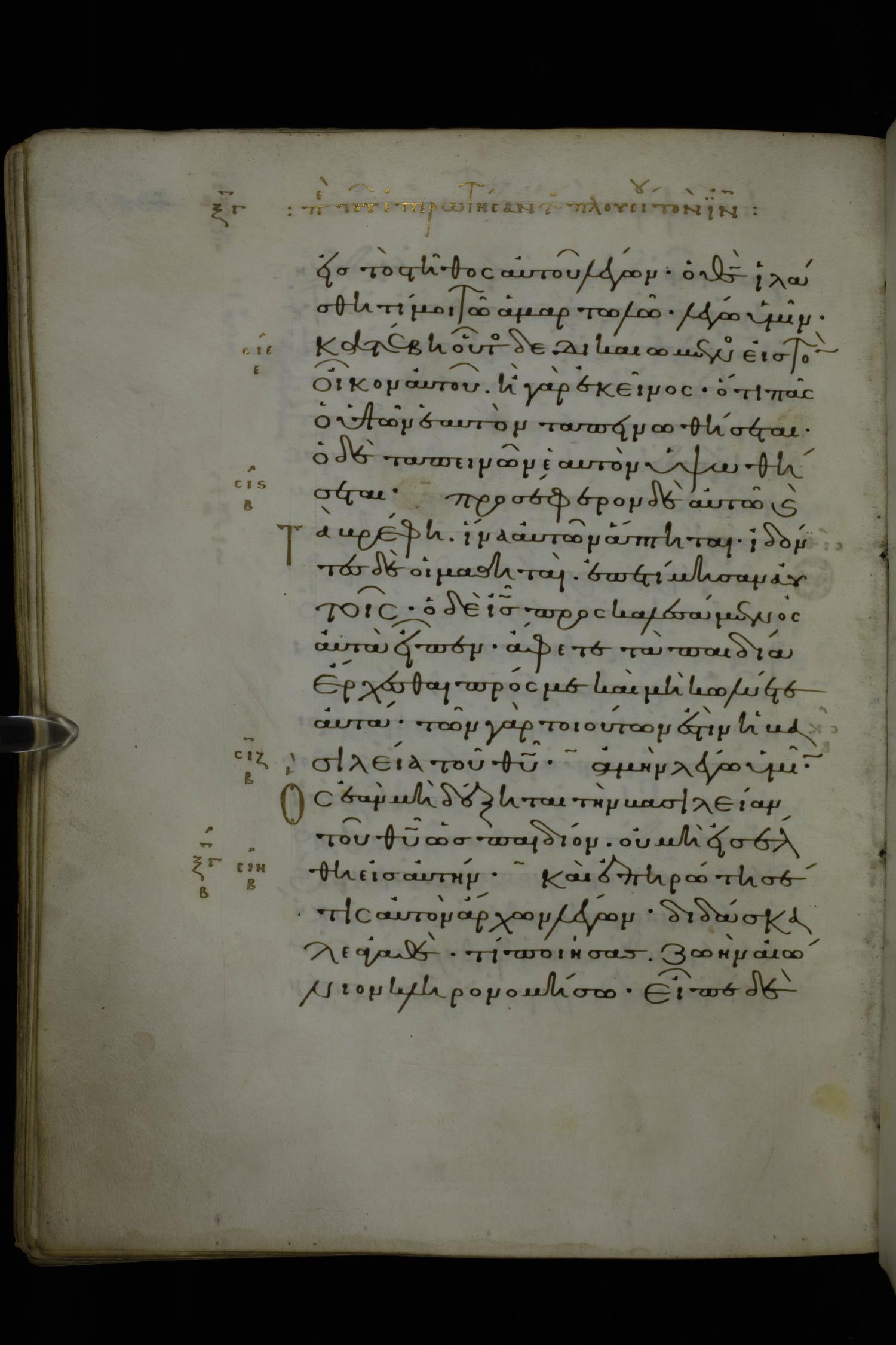 Eleventh century minuscule of Gospels on parchment; 370 leaves, 1 column, 20 lines per column. Images were taken at the National Library of Greece in Athens.