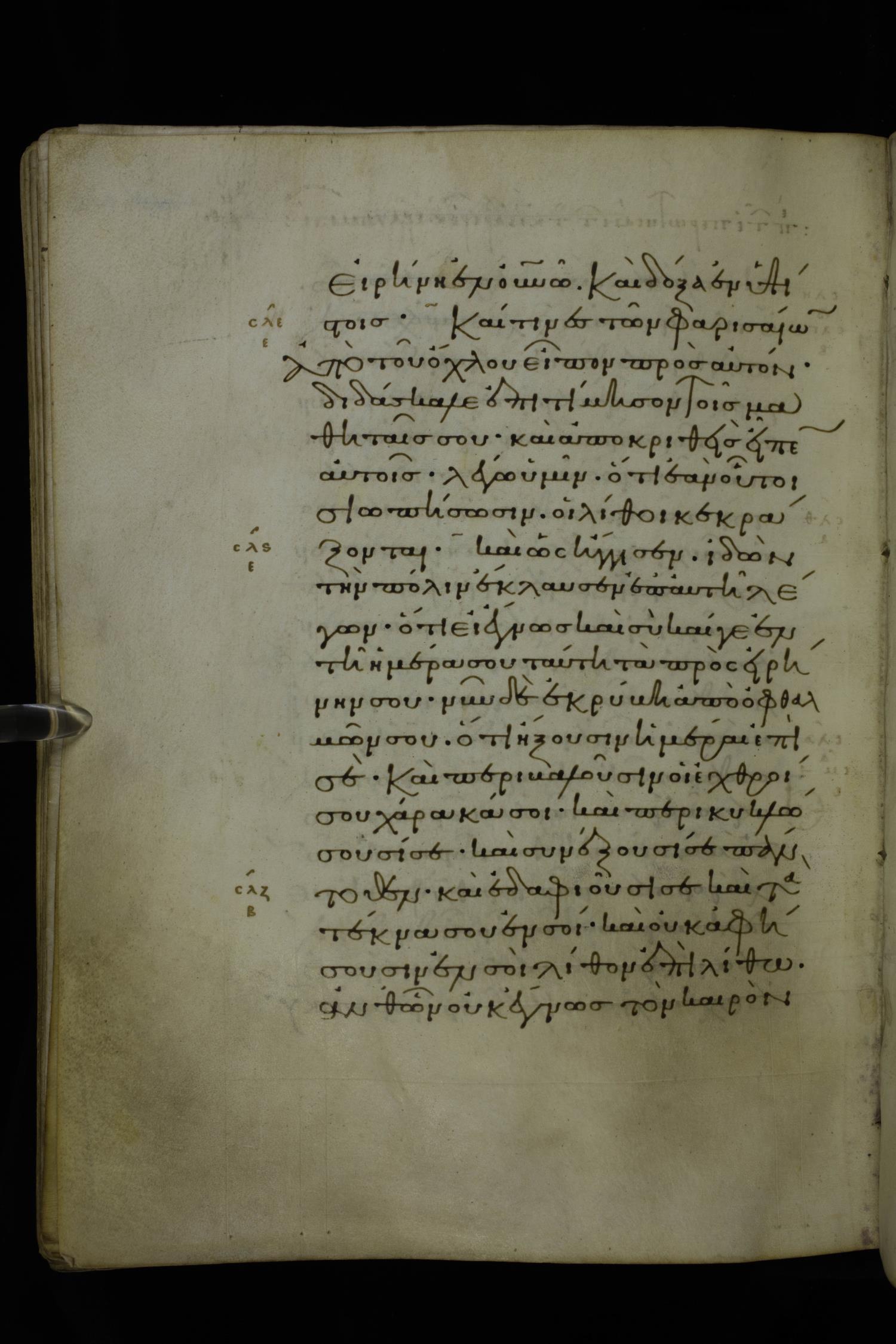 Eleventh century minuscule of Gospels on parchment; 370 leaves, 1 column, 20 lines per column. Images were taken at the National Library of Greece in Athens.