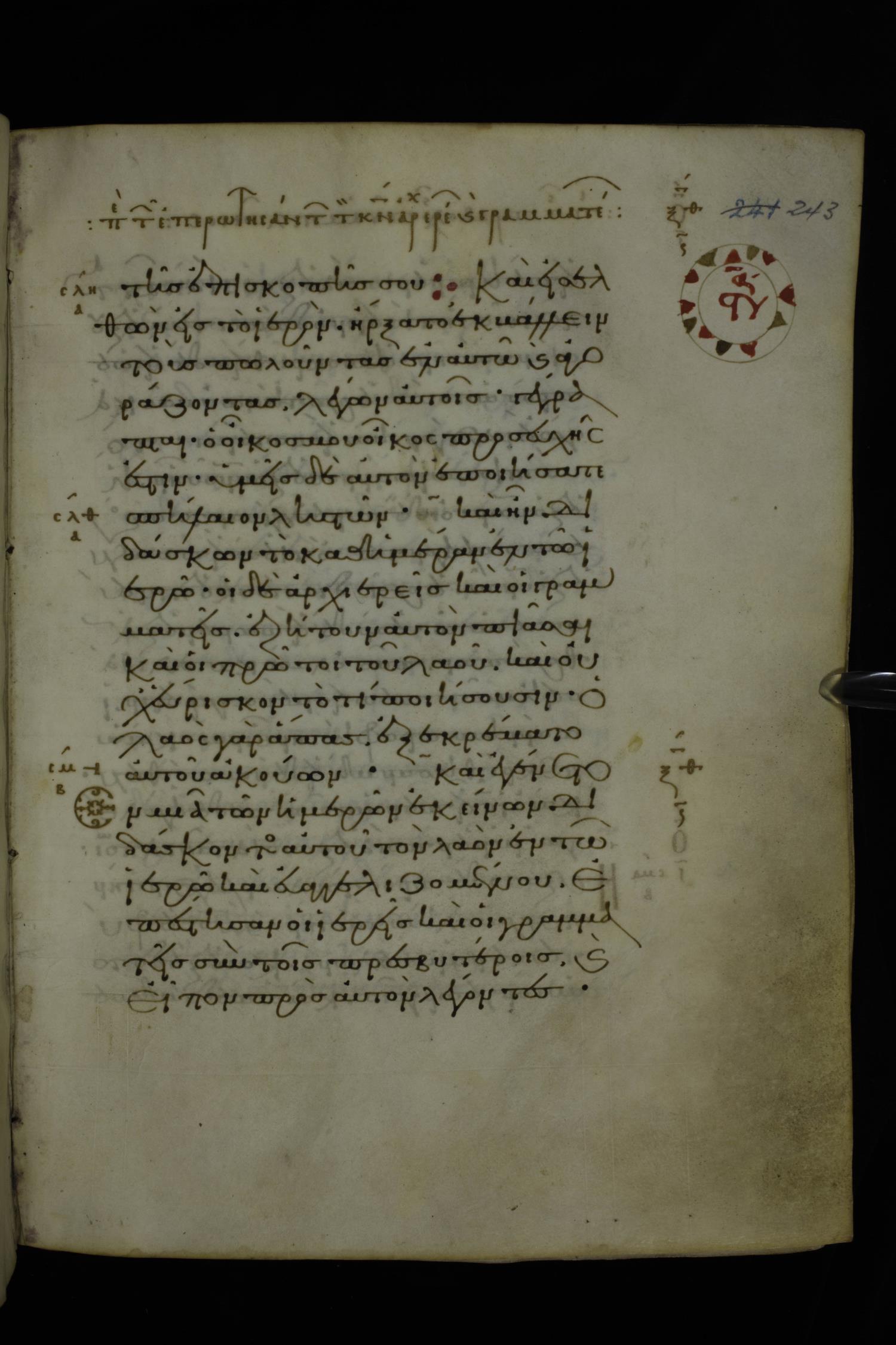 Eleventh century minuscule of Gospels on parchment; 370 leaves, 1 column, 20 lines per column. Images were taken at the National Library of Greece in Athens.