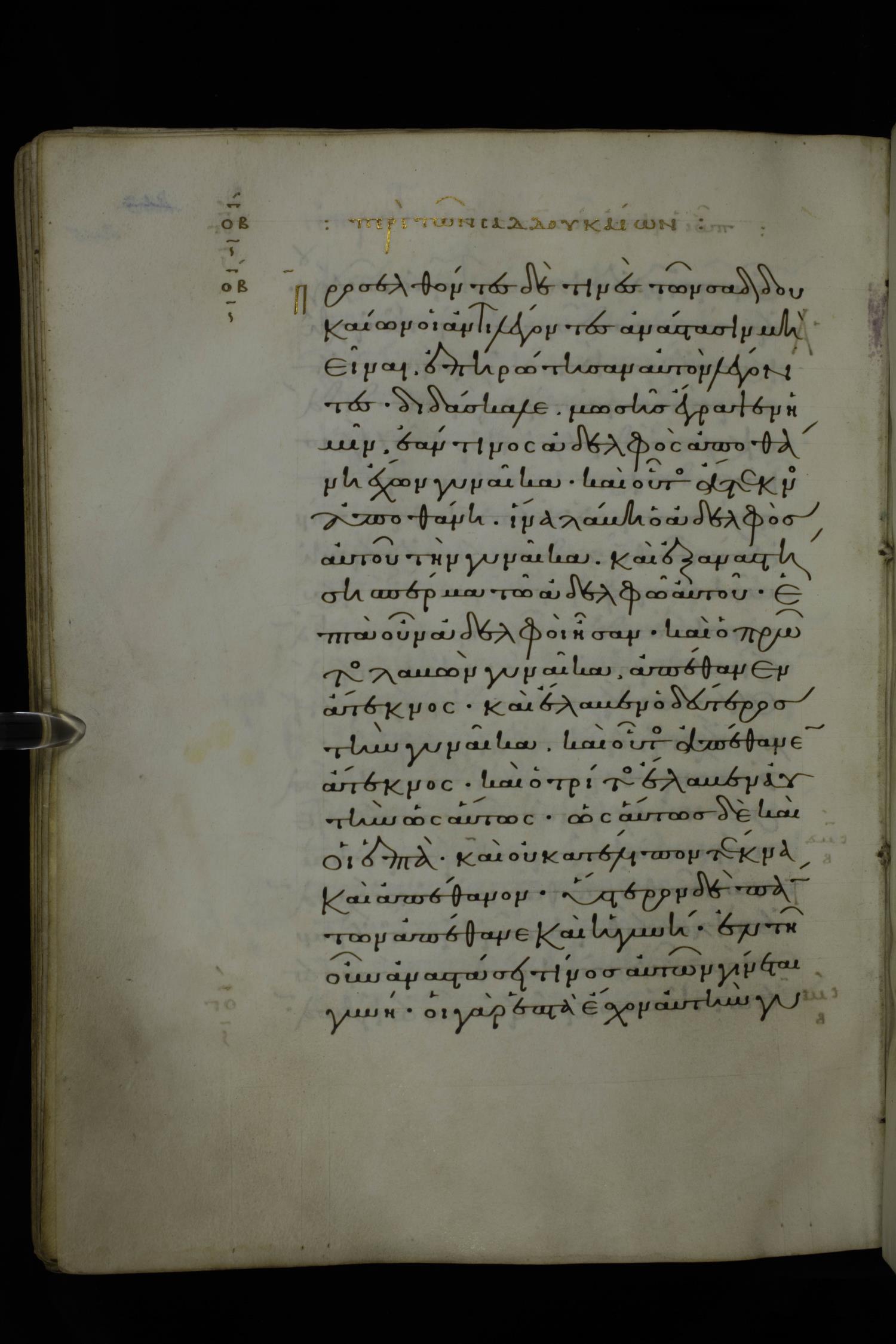 Eleventh century minuscule of Gospels on parchment; 370 leaves, 1 column, 20 lines per column. Images were taken at the National Library of Greece in Athens.