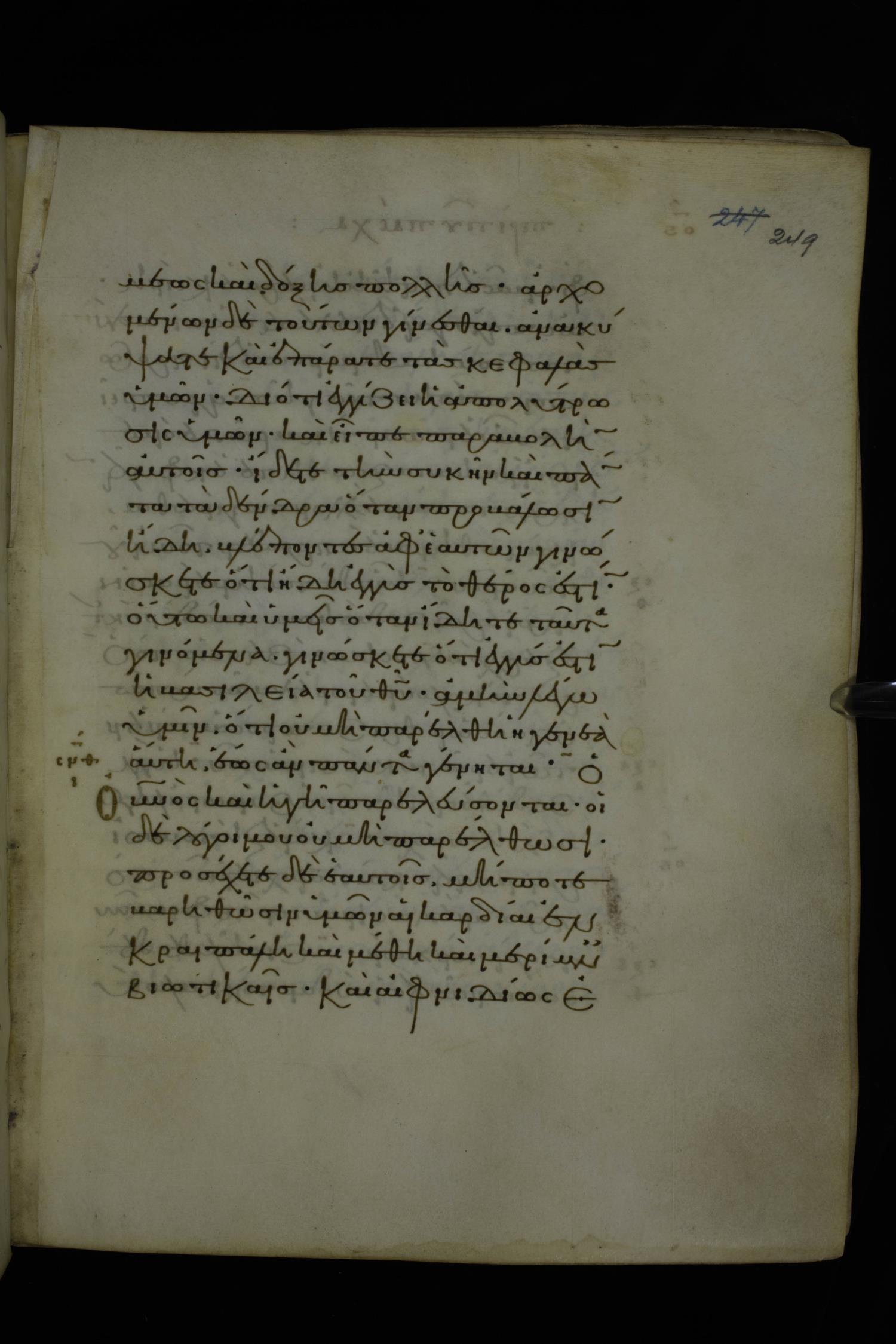 Eleventh century minuscule of Gospels on parchment; 370 leaves, 1 column, 20 lines per column. Images were taken at the National Library of Greece in Athens.