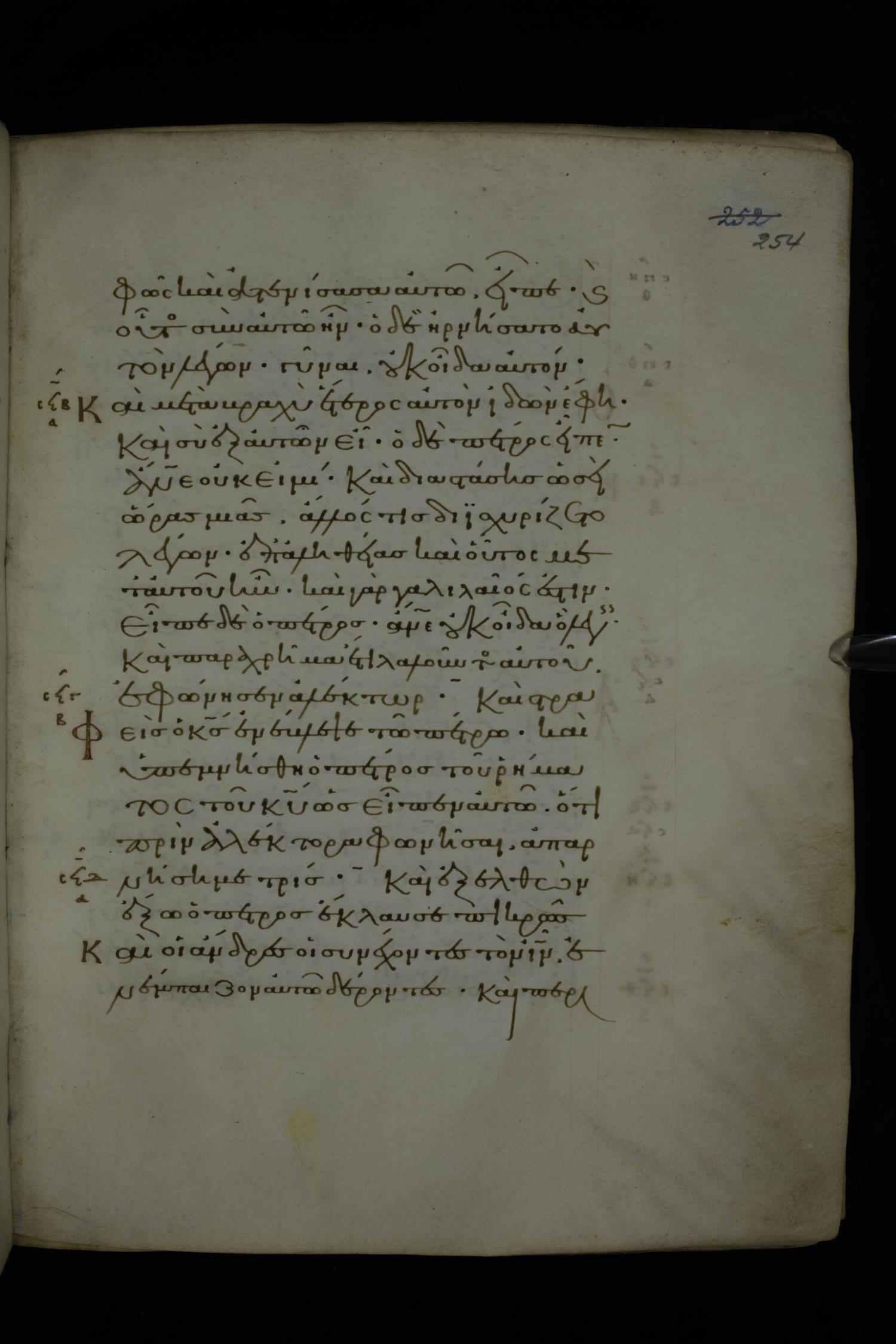 Eleventh century minuscule of Gospels on parchment; 370 leaves, 1 column, 20 lines per column. Images were taken at the National Library of Greece in Athens.