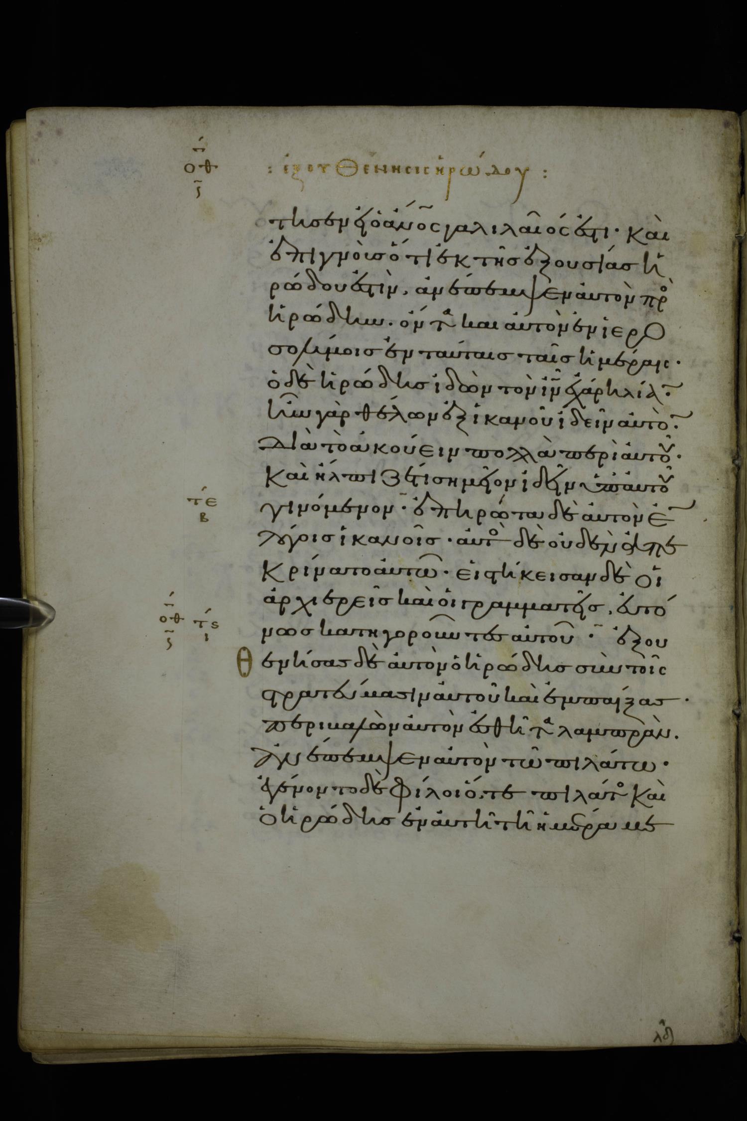 Eleventh century minuscule of Gospels on parchment; 370 leaves, 1 column, 20 lines per column. Images were taken at the National Library of Greece in Athens.