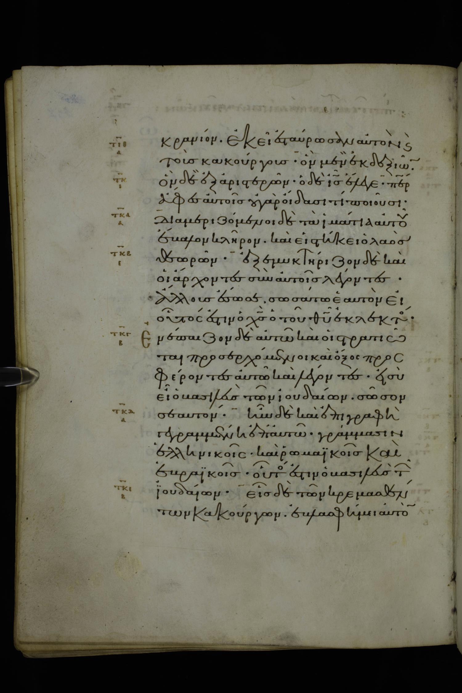 Eleventh century minuscule of Gospels on parchment; 370 leaves, 1 column, 20 lines per column. Images were taken at the National Library of Greece in Athens.