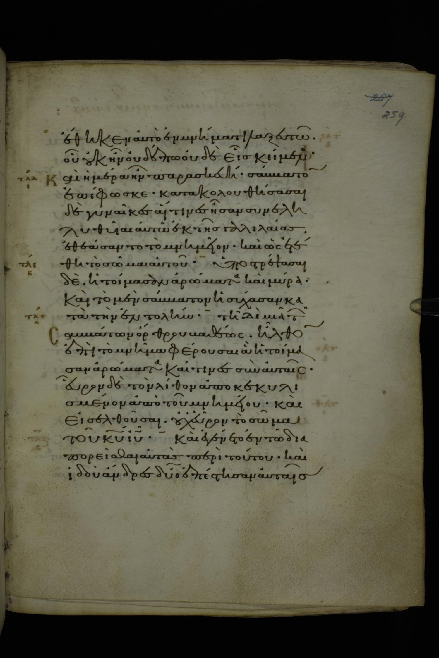 Eleventh century minuscule of Gospels on parchment; 370 leaves, 1 column, 20 lines per column. Images were taken at the National Library of Greece in Athens.