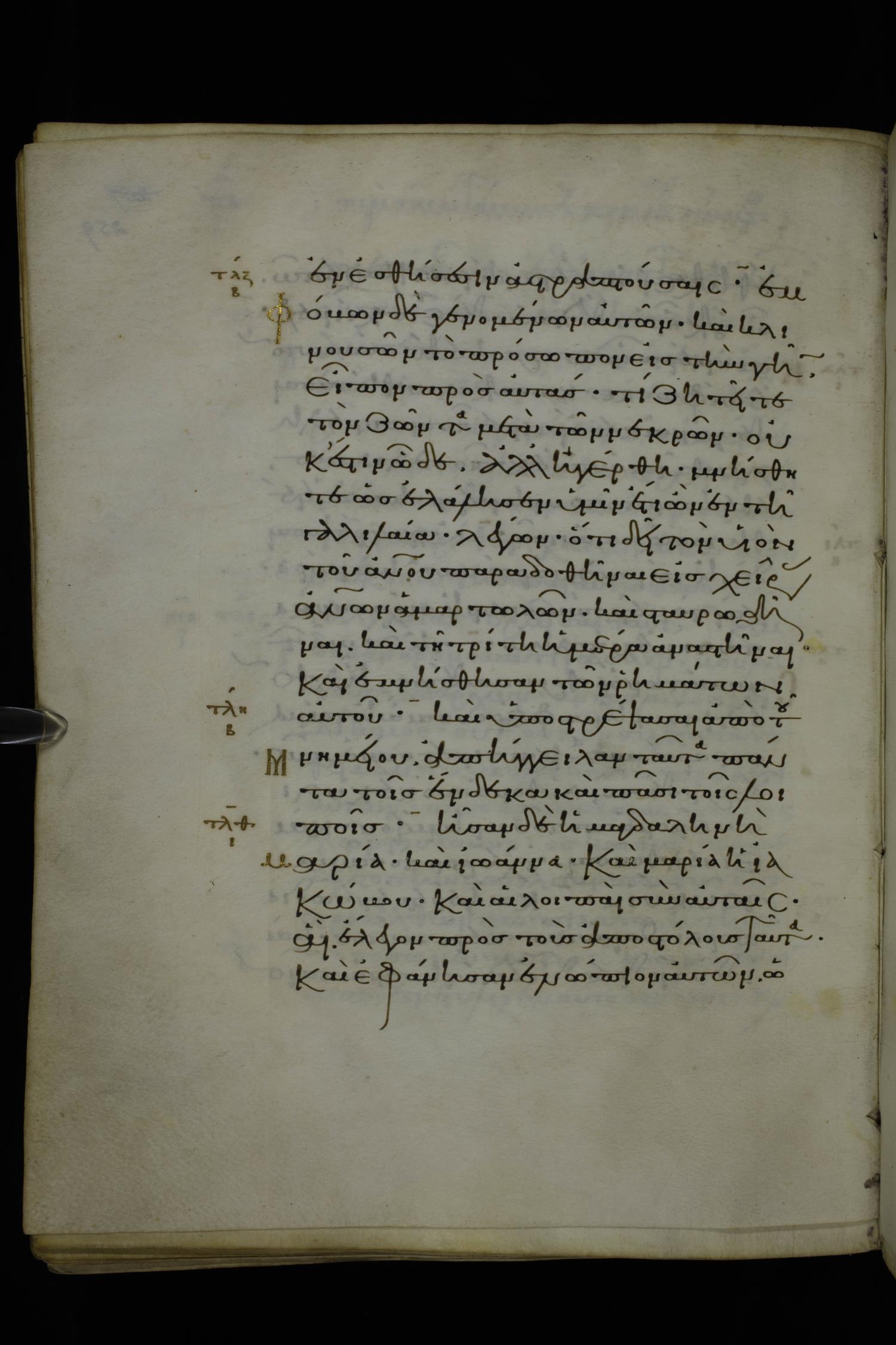 Eleventh century minuscule of Gospels on parchment; 370 leaves, 1 column, 20 lines per column. Images were taken at the National Library of Greece in Athens.