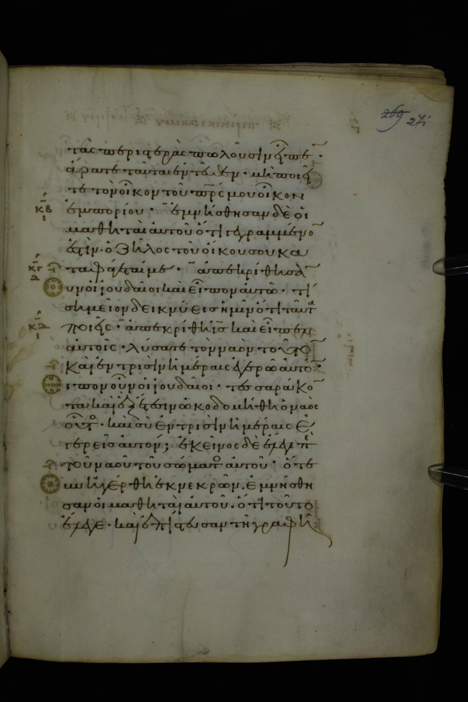 Eleventh century minuscule of Gospels on parchment; 370 leaves, 1 column, 20 lines per column. Images were taken at the National Library of Greece in Athens.