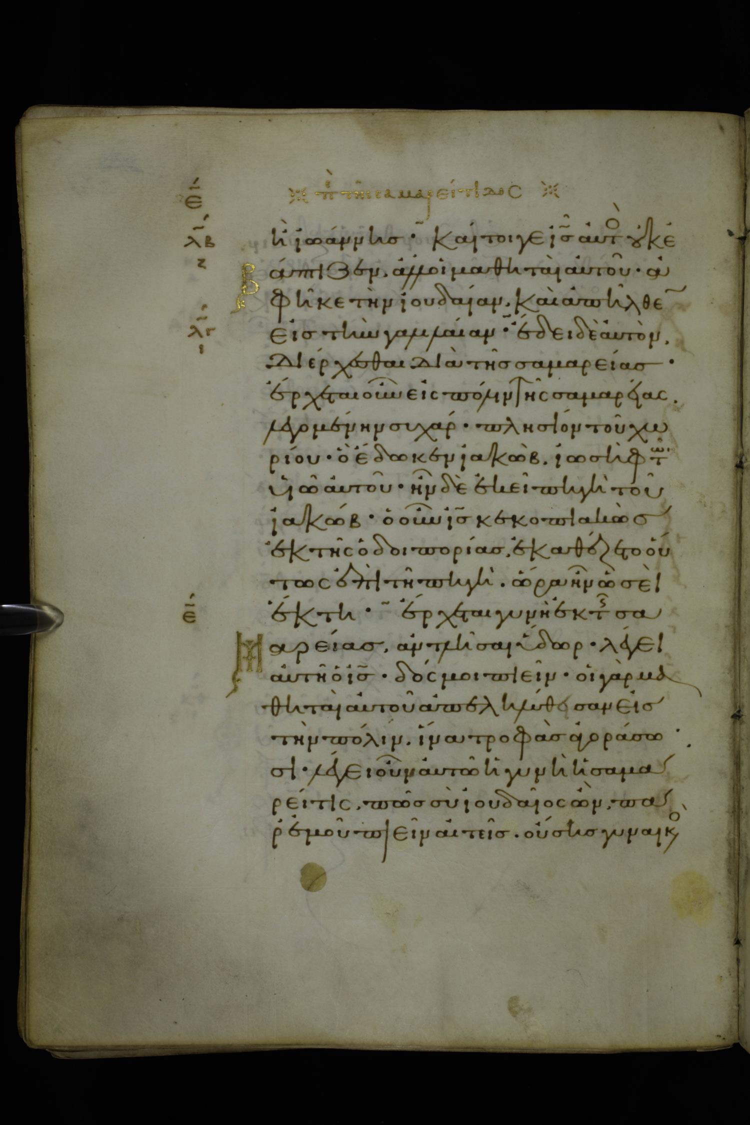 Eleventh century minuscule of Gospels on parchment; 370 leaves, 1 column, 20 lines per column. Images were taken at the National Library of Greece in Athens.