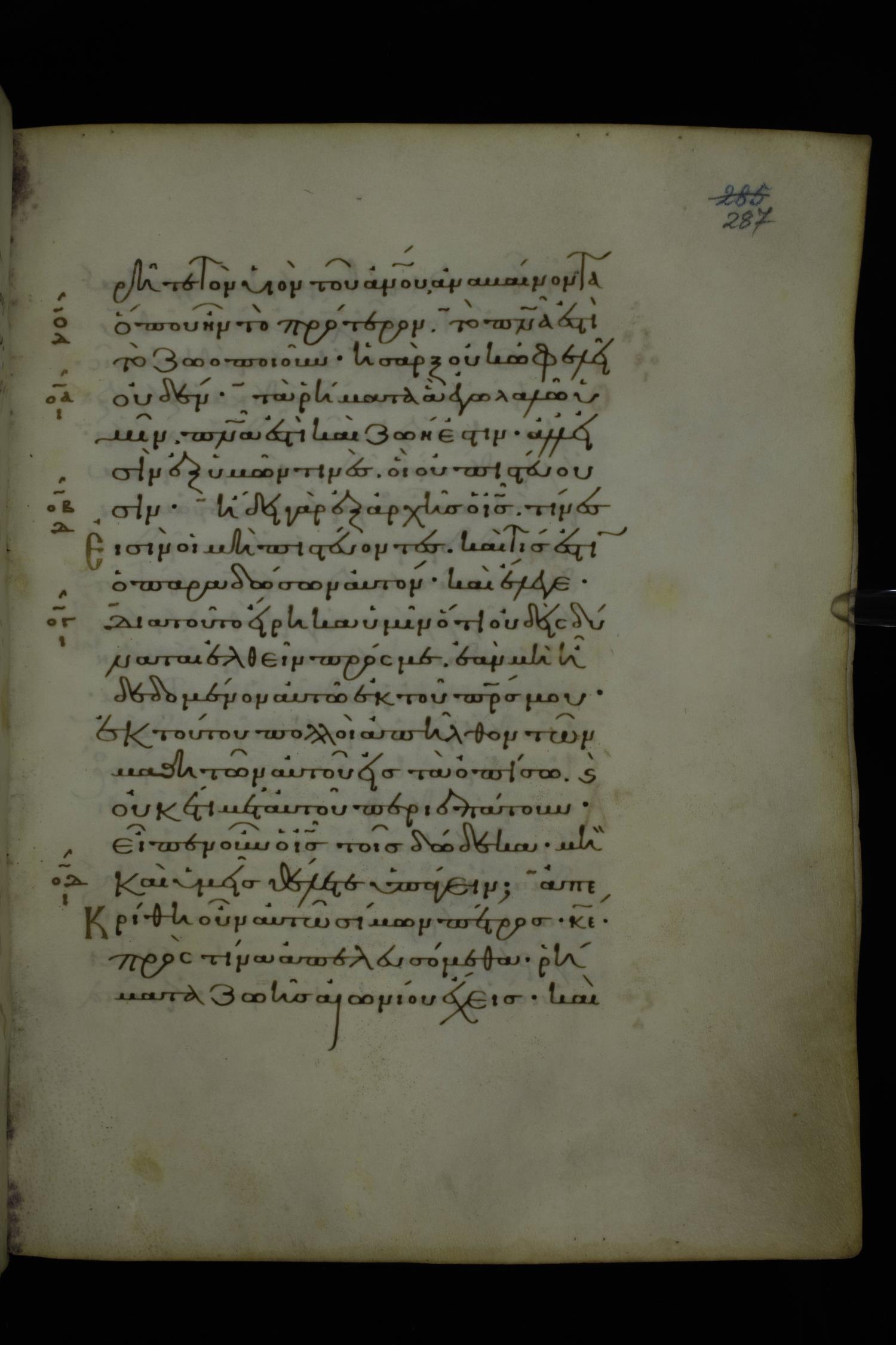 Eleventh century minuscule of Gospels on parchment; 370 leaves, 1 column, 20 lines per column. Images were taken at the National Library of Greece in Athens.