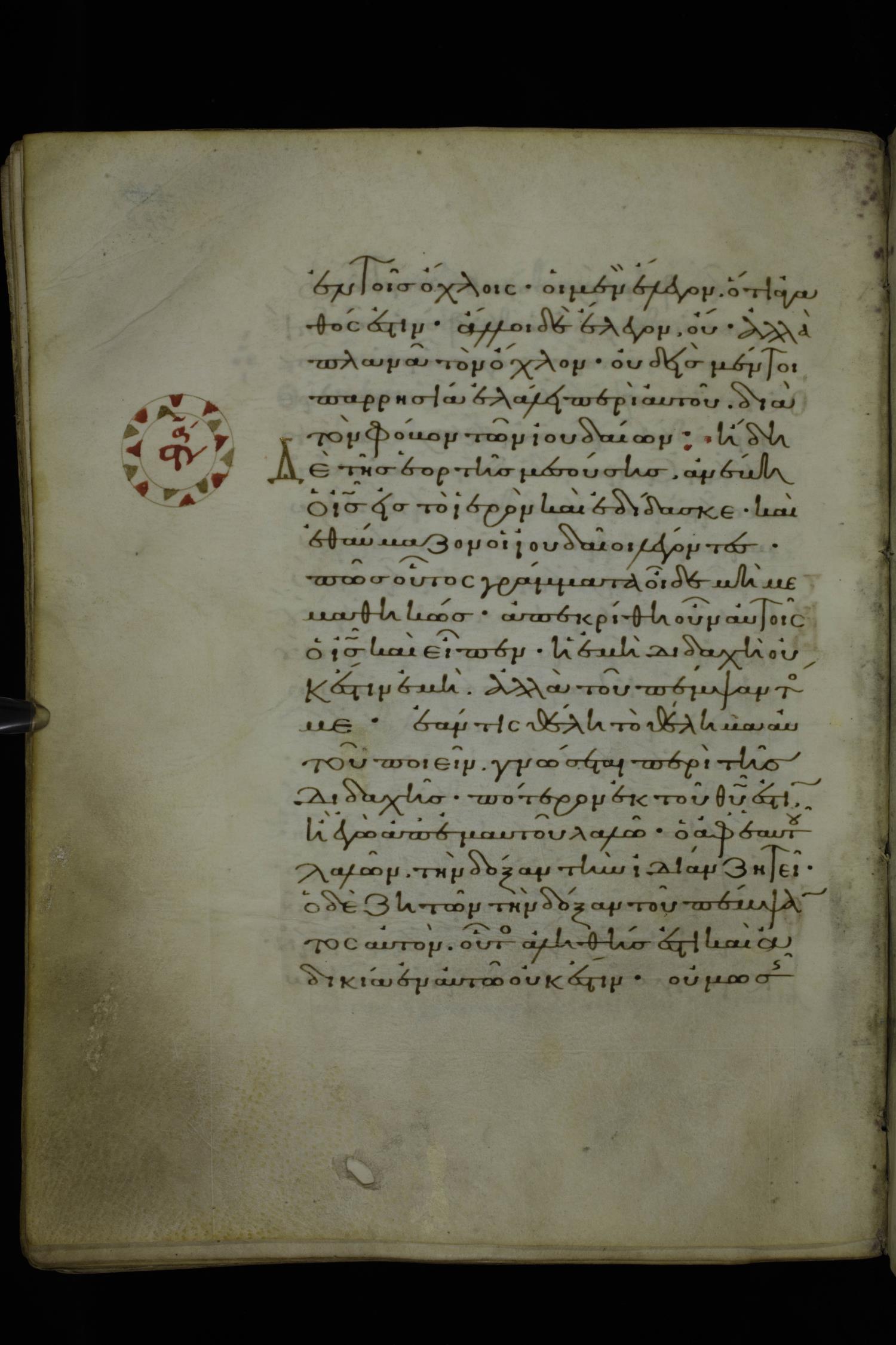 Eleventh century minuscule of Gospels on parchment; 370 leaves, 1 column, 20 lines per column. Images were taken at the National Library of Greece in Athens.